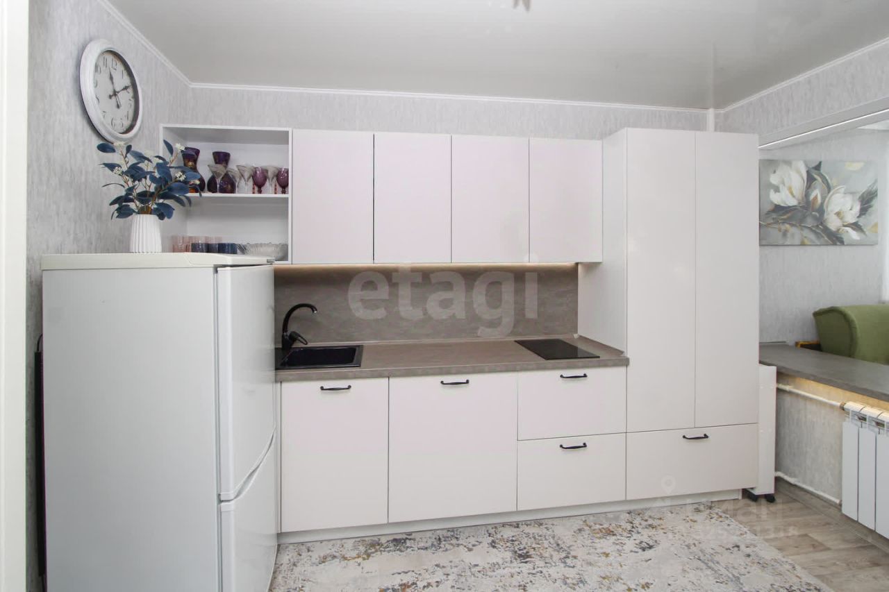 При продаже остается современный кухонный гарнитур со встроенной варочной поверхностью и стиральной машинкой.