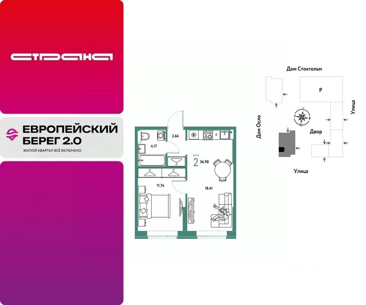 Продается 2комнатная квартира на 4 этаже от застройщика Страна Девелопмент. Площадь квартиры 36,98 кв. м.