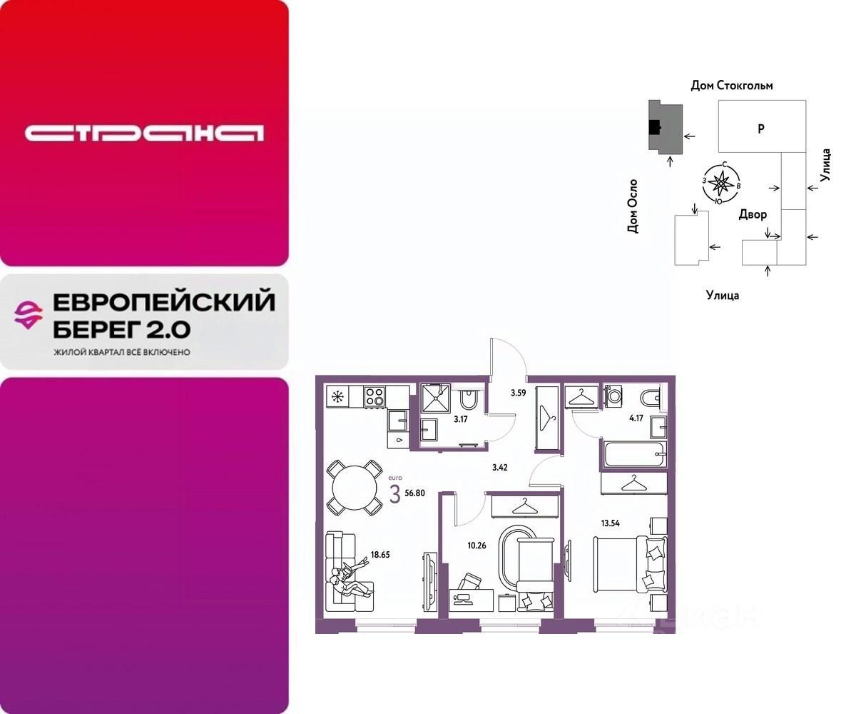Продается 3комнатная квартира на 3 этаже от застройщика Страна Девелопмент. Площадь квартиры 56,8 кв. м.