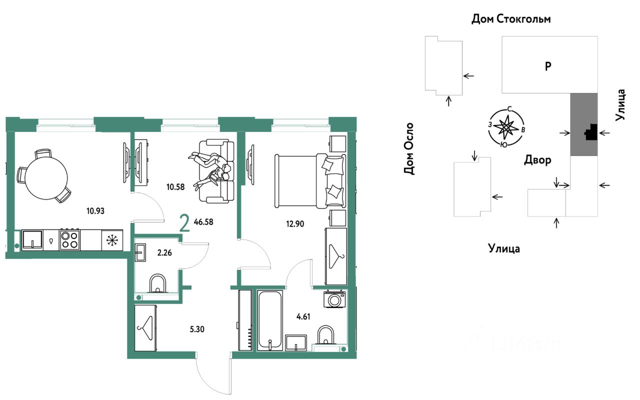 Продается 2комнатная квартира на 15 этаже от застройщика Страна Девелопмент. Площадь квартиры 46,58 кв. м.