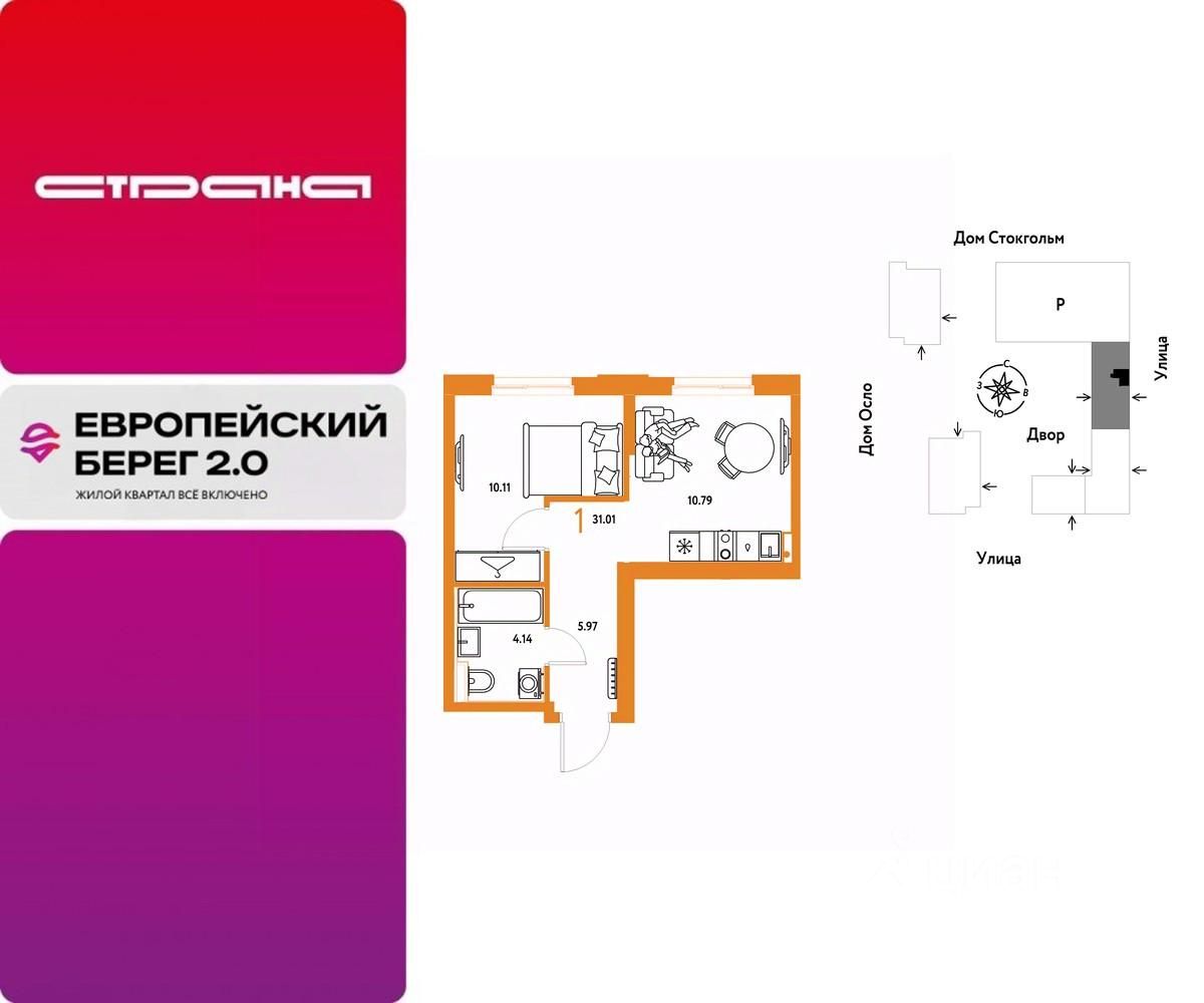 Продается 1комнатная квартира на 18 этаже от застройщика Страна Девелопмент. Площадь квартиры 31,01 кв. м.