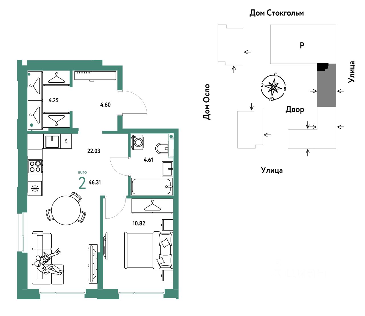 Продается 2комнатная квартира на 19 этаже от застройщика Страна Девелопмент. Площадь квартиры 46,31 кв. м.