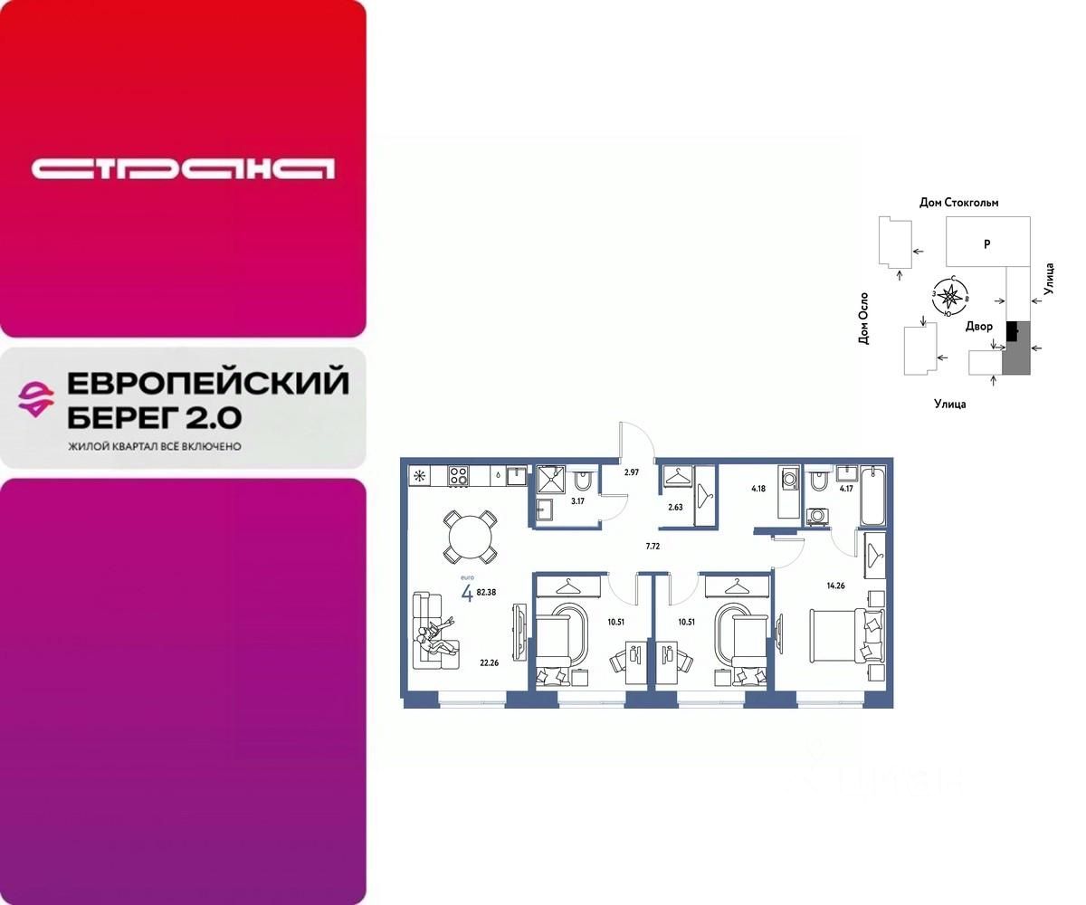 Продается 4комнатная квартира на 4 этаже от застройщика Страна Девелопмент. Площадь квартиры 82,38 кв. м.