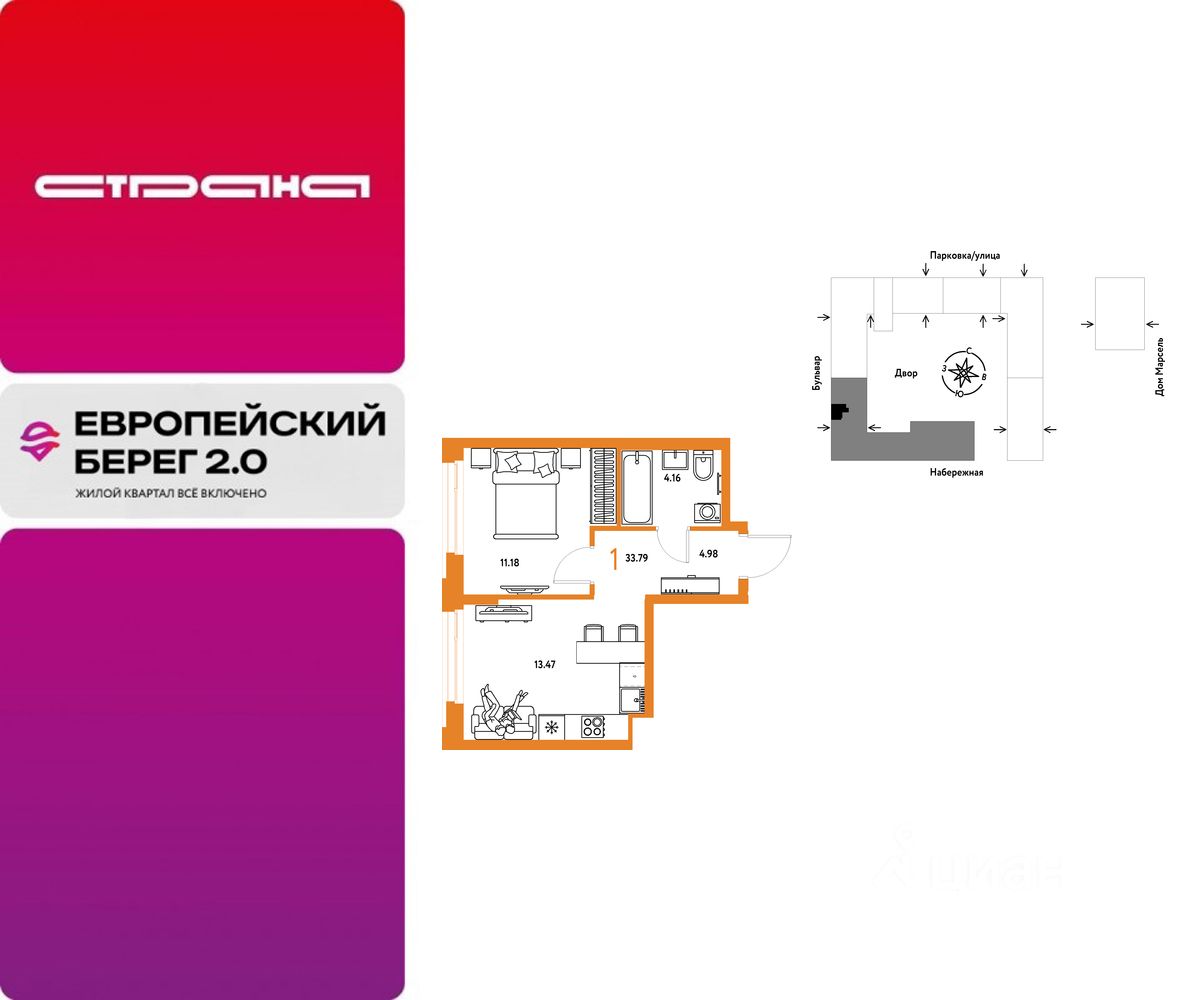Продается 1комнатная квартира на 4 этаже от застройщика Страна Девелопмент. Площадь квартиры 33,79 кв. м. Стоимость указана без учета акций.