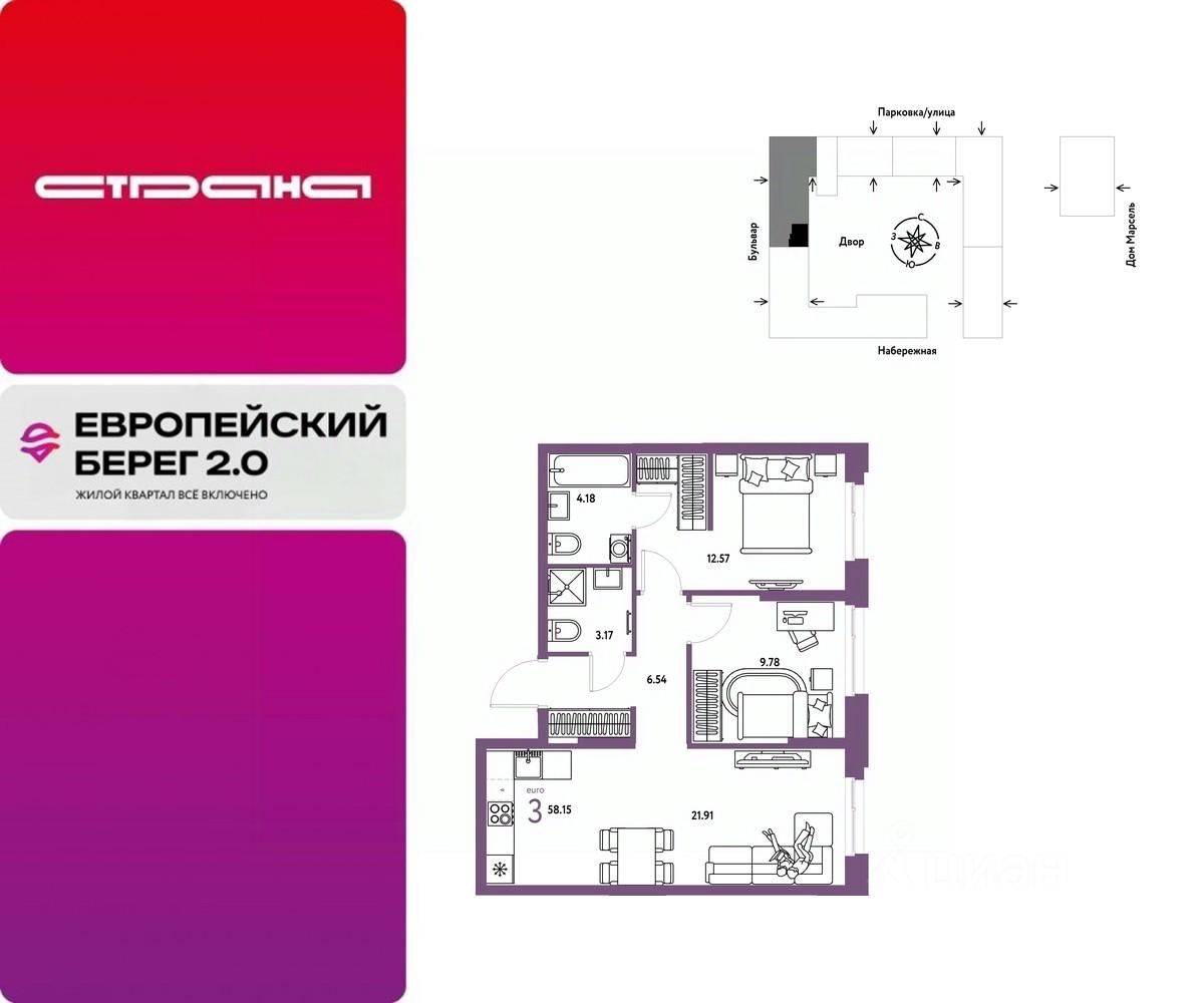 Продается 3комнатная квартира на 7 этаже от застройщика Страна Девелопмент. Площадь квартиры 58,15 кв. м. Стоимость указана без учета акций.