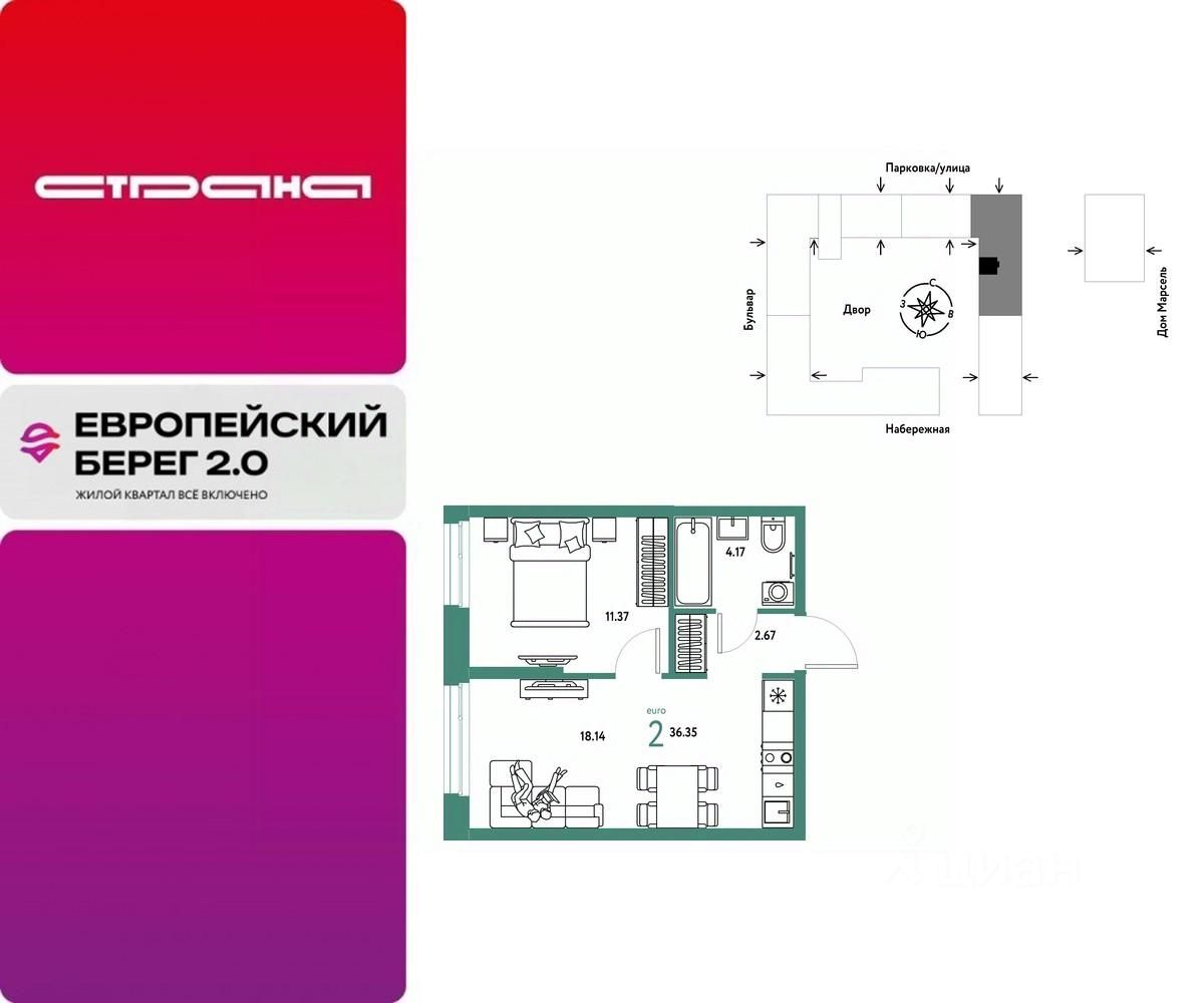 Продается 2комнатная квартира на 4 этаже от застройщика Страна Девелопмент. Площадь квартиры 36,35 кв. м.
