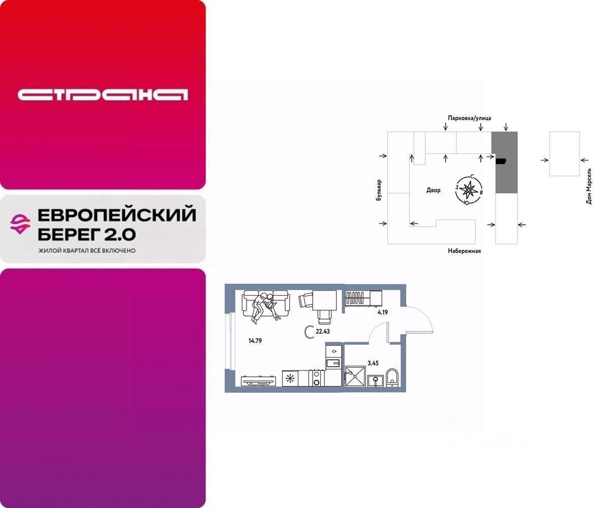 Продается 1комнатная квартира на 12 этаже от застройщика Страна Девелопмент. Площадь квартиры 22,43 кв. м. Стоимость указана без учета акций.