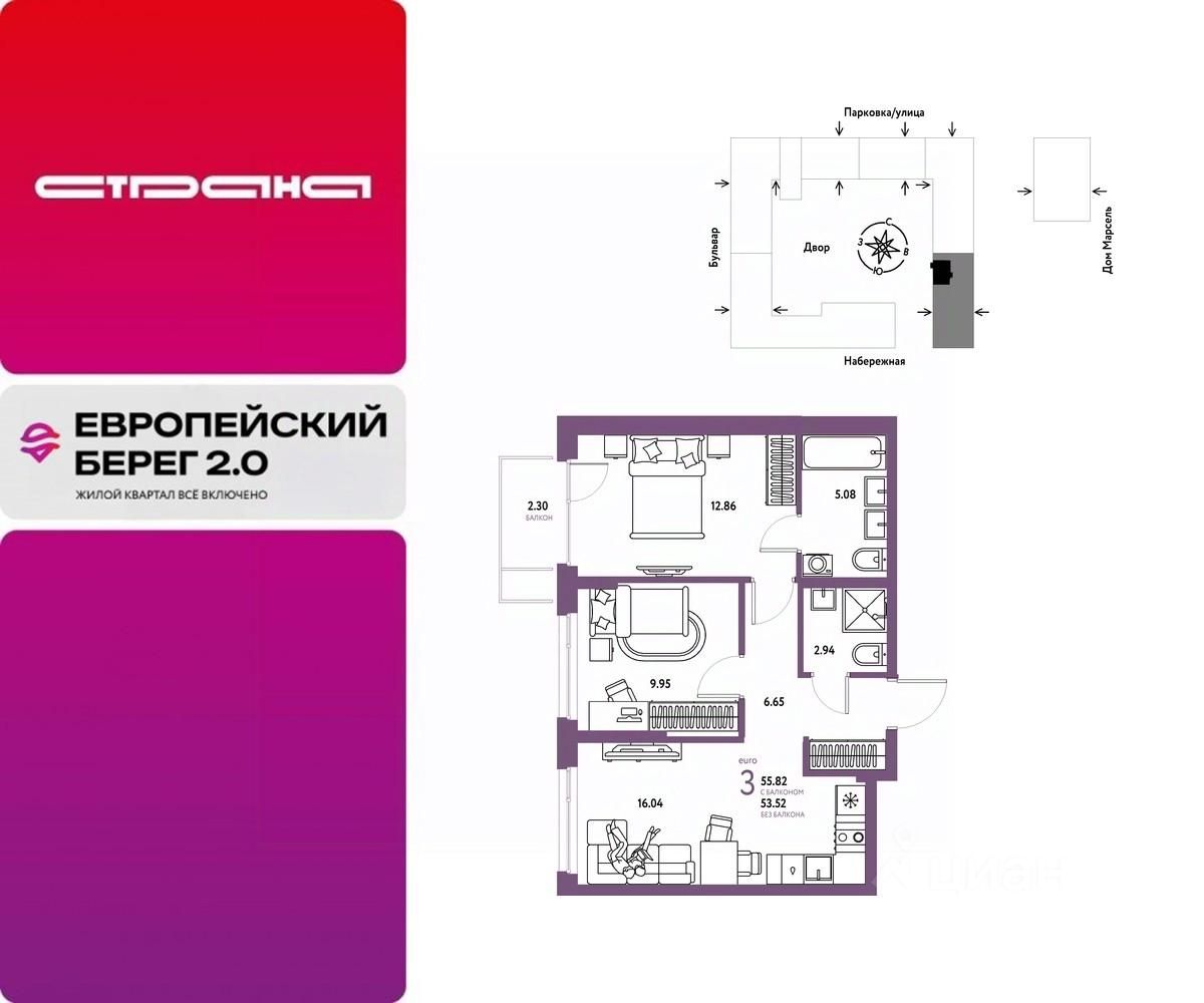 Продается 3комнатная квартира на 11 этаже от застройщика Страна Девелопмент. Площадь квартиры 55,82 кв. м. Стоимость указана без учета акций.