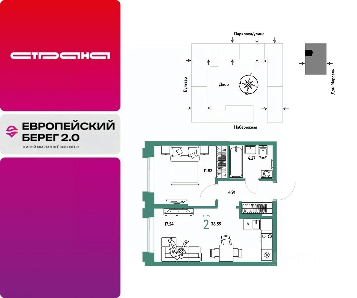 Продается 2комнатная квартира на 23 этаже от застройщика Страна Девелопмент. Площадь квартиры 38,55 кв. м. Стоимость указана без учета акций.