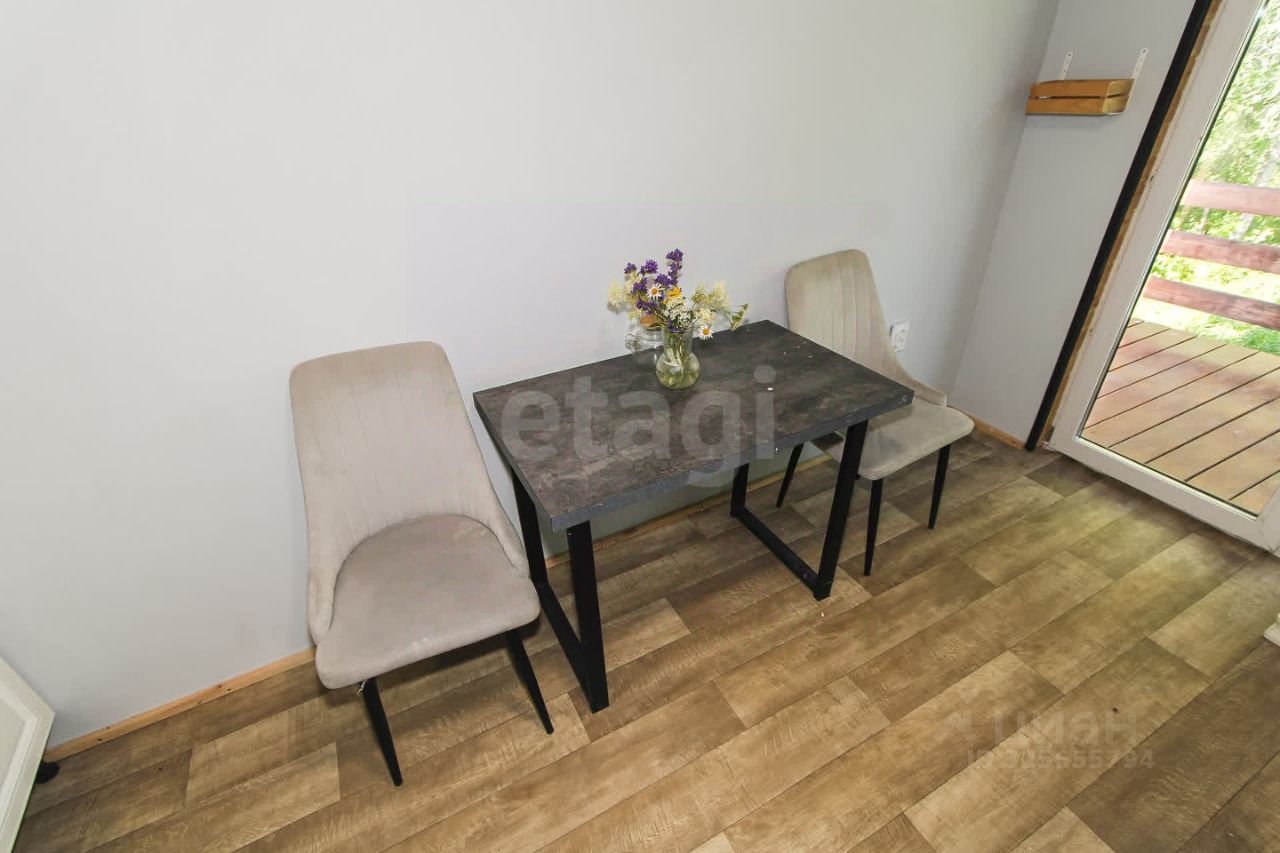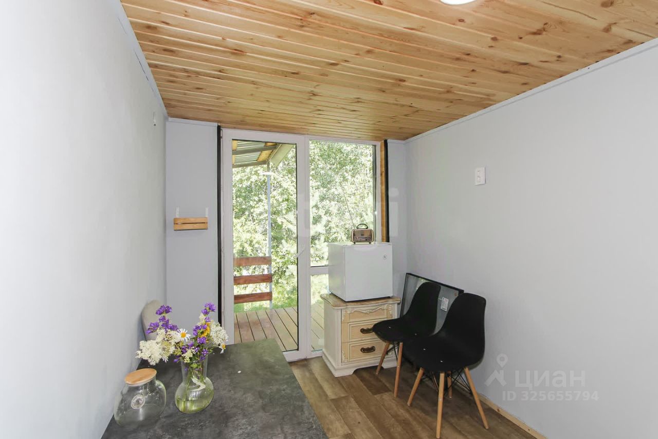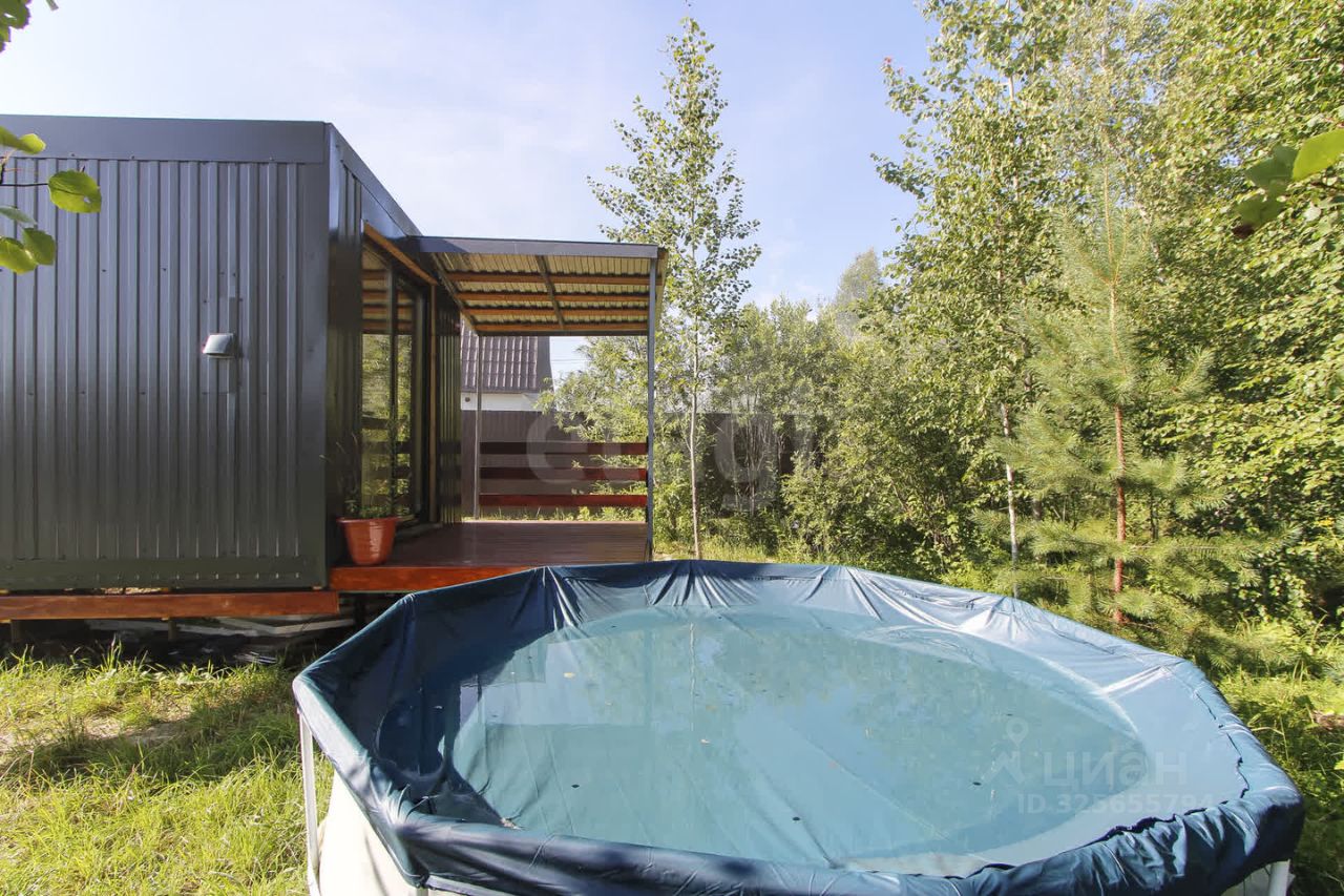 Панорамное окно в гостиной выходит в сторону леса, создавая ощущение единения с природой. Дом приподнят над землей, что исключает проникновение грызунов. Санузел отделан керамогранитом и линолеумом, что упрощает уход. Крытая терраса из лиственницы позволяет отдыхать на свежем воздухе в любую погоду. На участке высажены плодовые деревья — яблони, облепиха, смородина, а плодородный чернозем подходит для садоводства. Водоснабжение обеспечивает колодец с чистой водой, а автономная канализация — стальной септик объемом 5,5 м