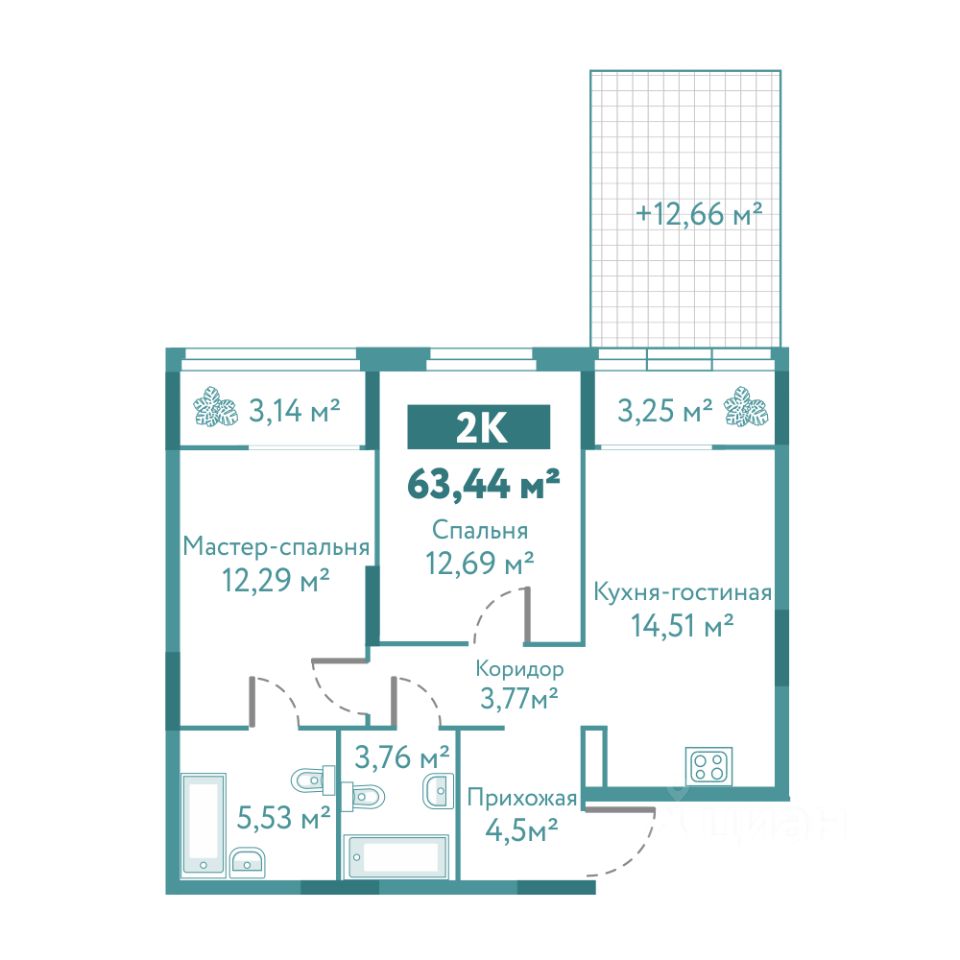 Общая площадь63,44 м2