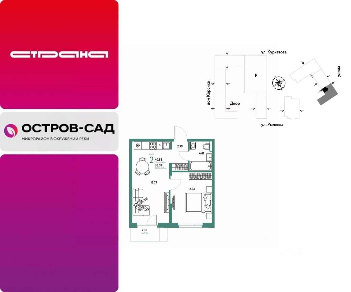 Продается 2комнатная квартира на 5 этаже от застройщика Страна Девелопмент. Площадь квартиры 40,88 кв. м.