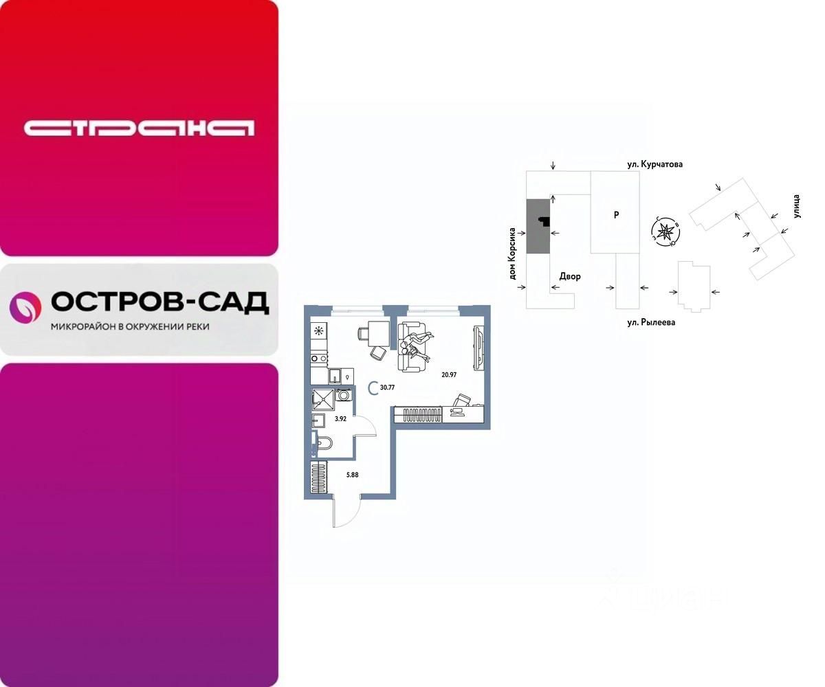 Продается 1комнатная квартира на 3 этаже от застройщика Страна Девелопмент. Площадь квартиры 30,77 кв. м.