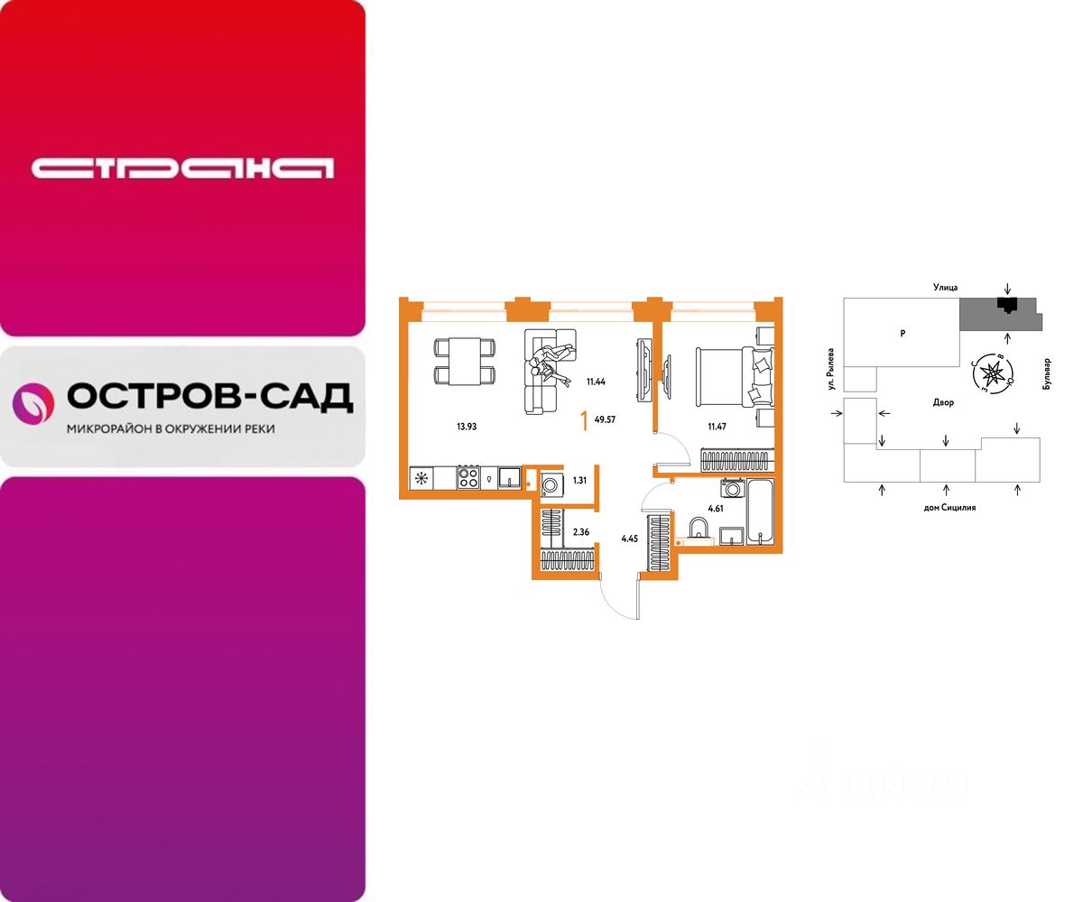 Продается 1комнатная квартира на 2 этаже от застройщика Страна Девелопмент. Площадь квартиры 49,57 кв. м.