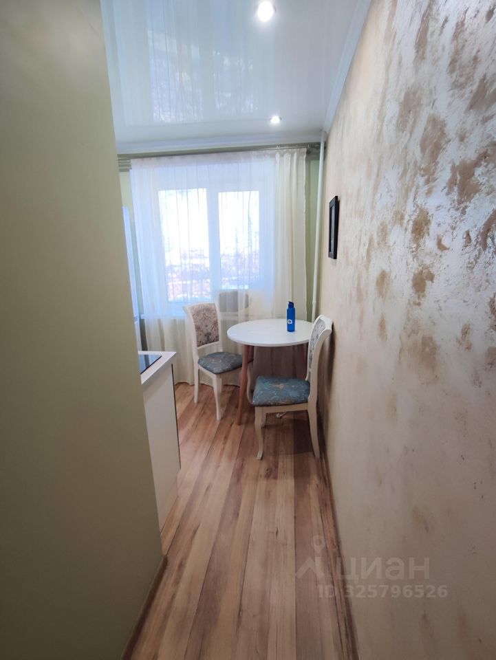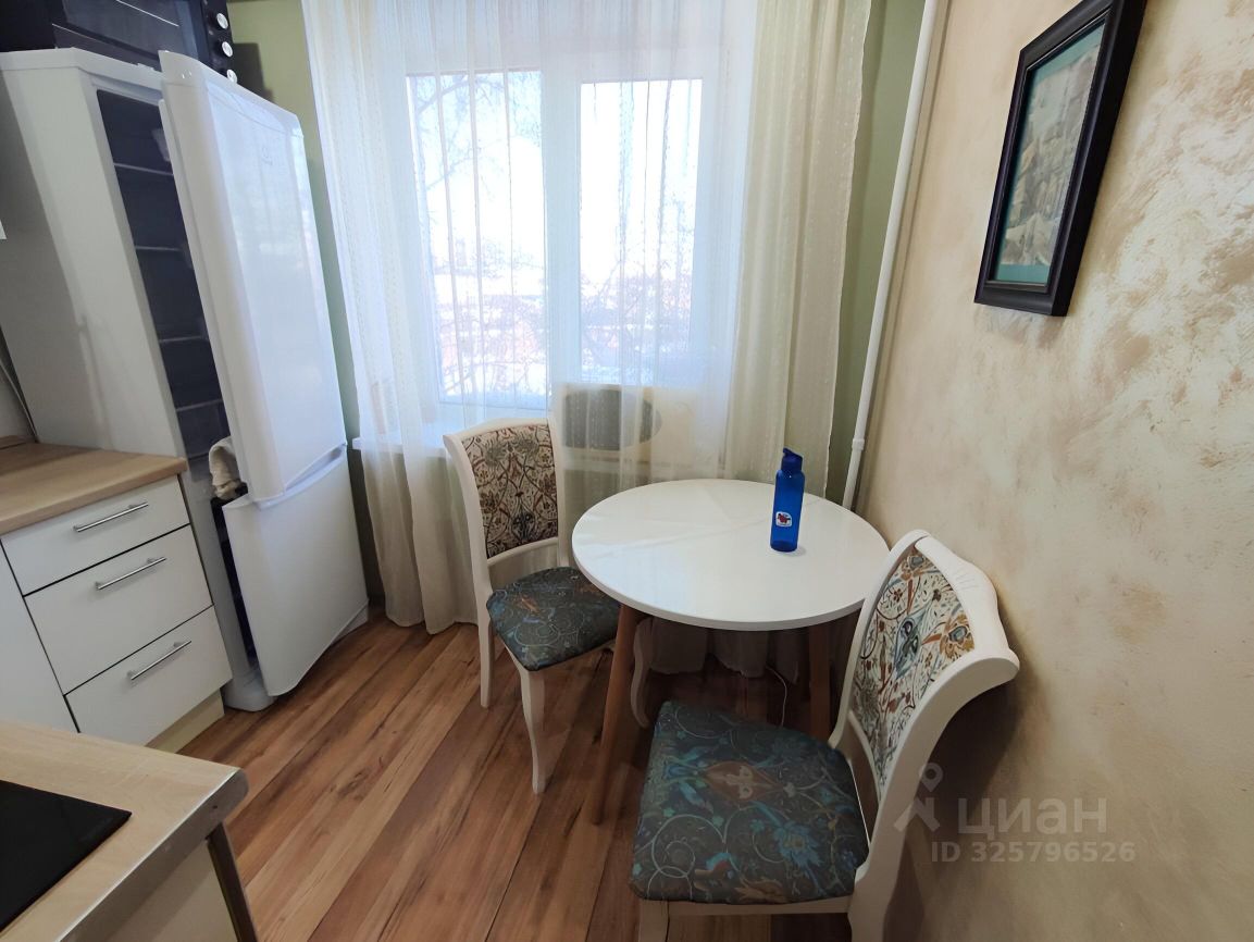 в кухне круглый стол с удобными стульями, есть керама плита и небольшой духовой шкаф
