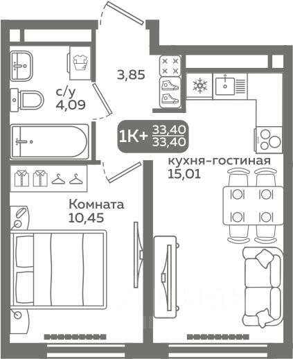 Прямая продажа от застройщика! Продается однокомнатная квартира в строящемся ЖК ''Меридиан Слобода'', срок сдачи: I-кв. 2027, общей площадью 33.4 м², на 9 этаже из 21. Площадь кухни — 15.01 м².