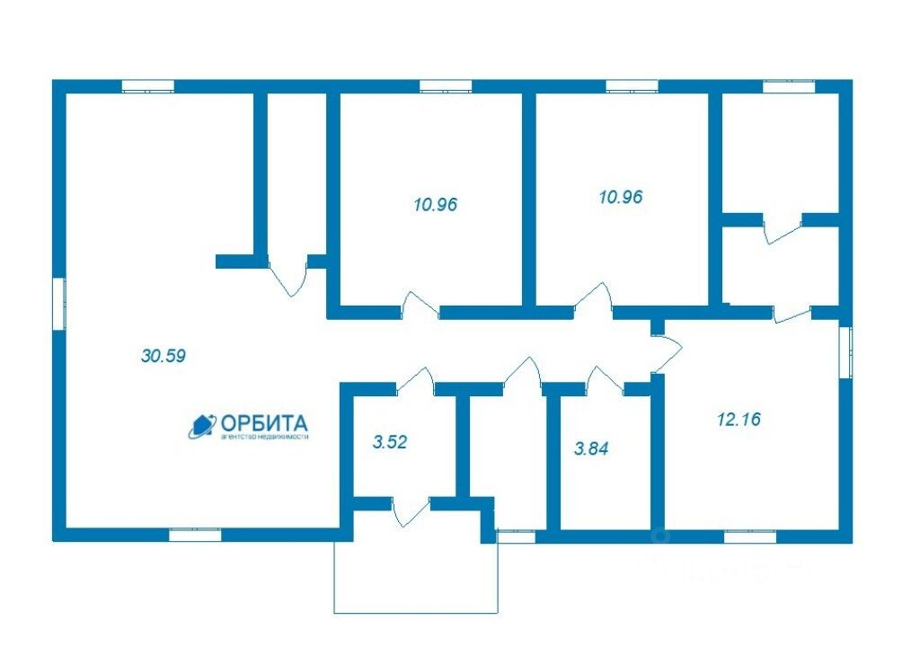 Общая площадь - 104 кв.м. Большая кухня-гостиная - 30,59 кв.м. Три спальни - 12,16 кв.м., 10,96 кв.м. и 10,96 кв.м. соответственно. Два сан. узла, котельная, мастер спальня, терасса.