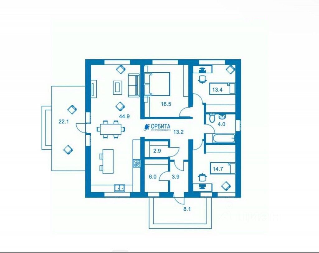 Планировка дома предполагает три спальни, два санузла, большую кухню-гостиную площадью 45 кв.м., большую крытую террасу размером более 22 м2.