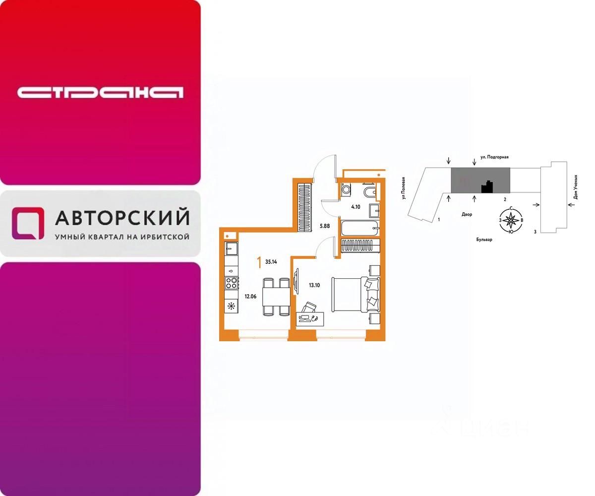 Продается 1комнатная квартира на 5 этаже от застройщика Страна Девелопмент. Площадь квартиры 35,14 кв. м.