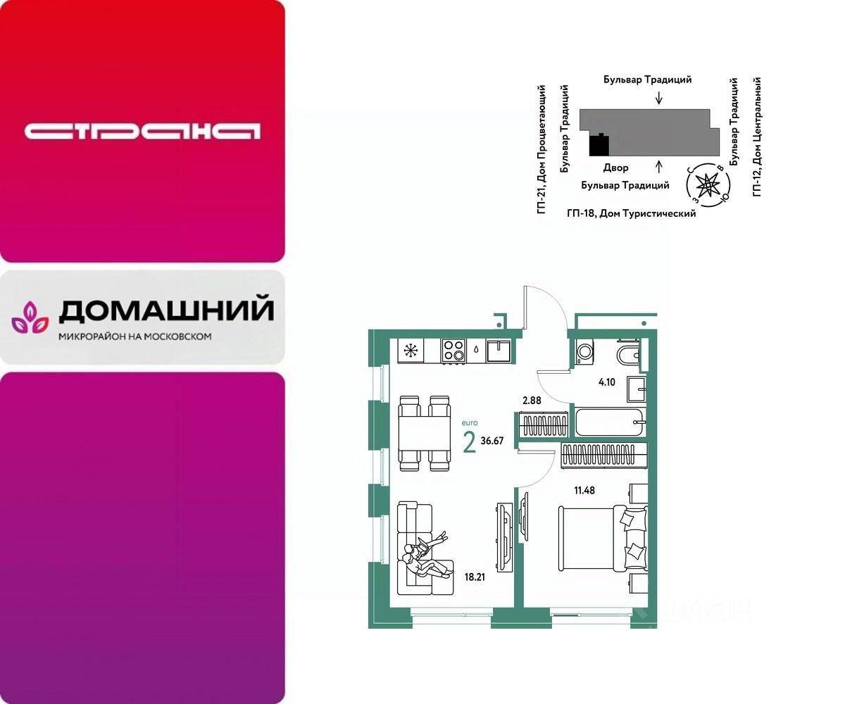 Продается 2комнатная квартира на 2 этаже от застройщика Страна Девелопмент. Площадь квартиры 36,67 кв. м.