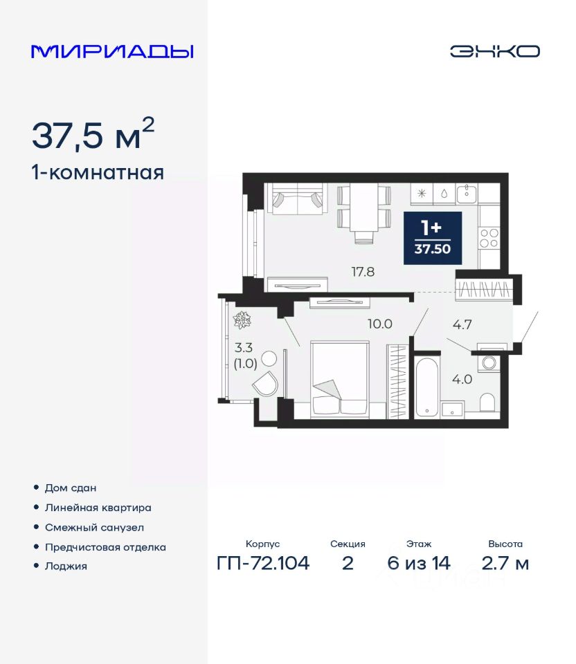 Продается однокомнатная квартира с предчистовой отделкой в ЖК ''Мириады'' на 6 этаже. Общая площадь: 37.5 кв.м., жилая: 10 кв.м., площадь просторной кухни-столовой: 17.8 кв.м. Все окна выходят на одну сторону. В квартире одна лоджия, один совмещенный санузел. Высота потолков 2.7 м.