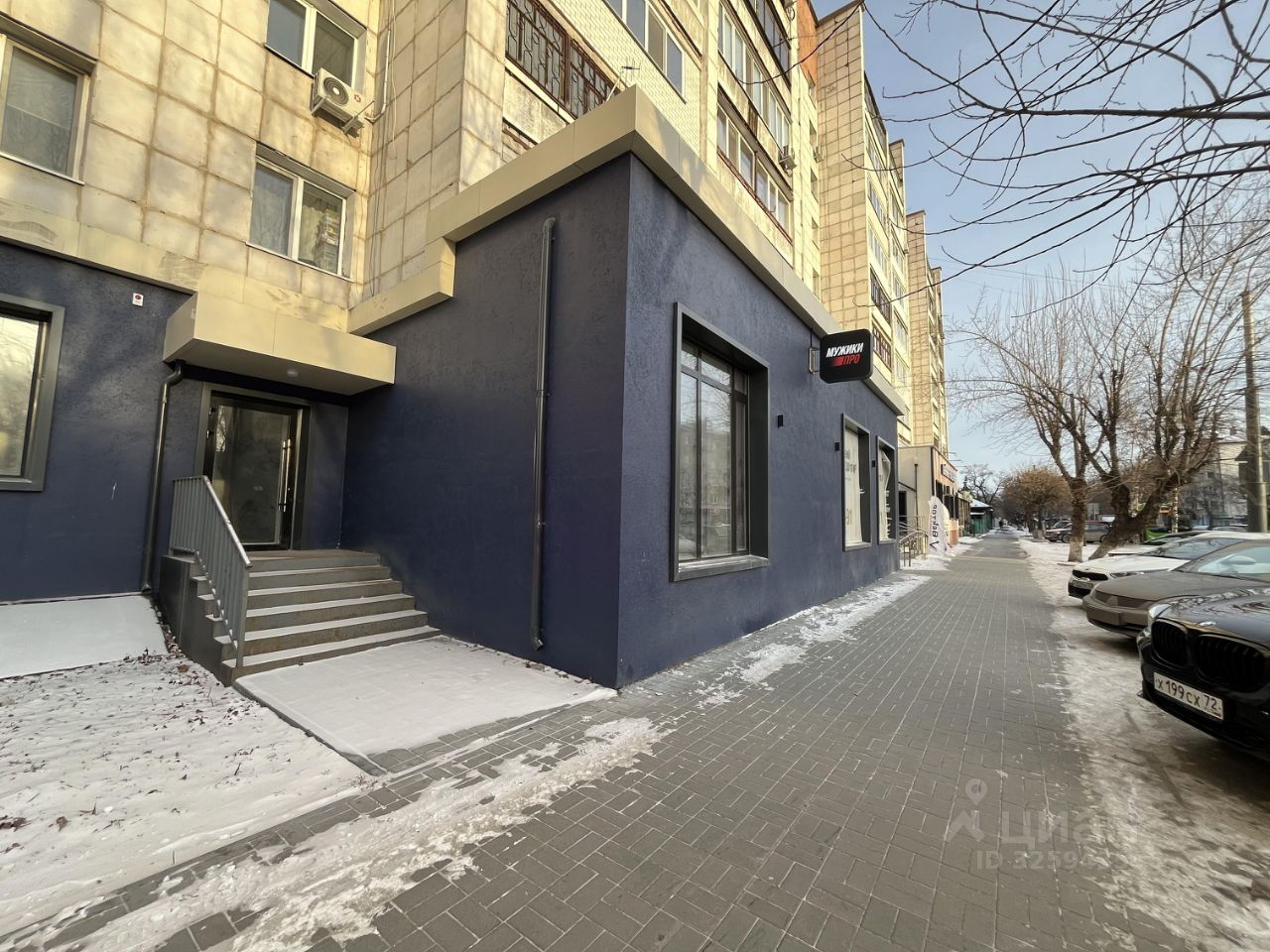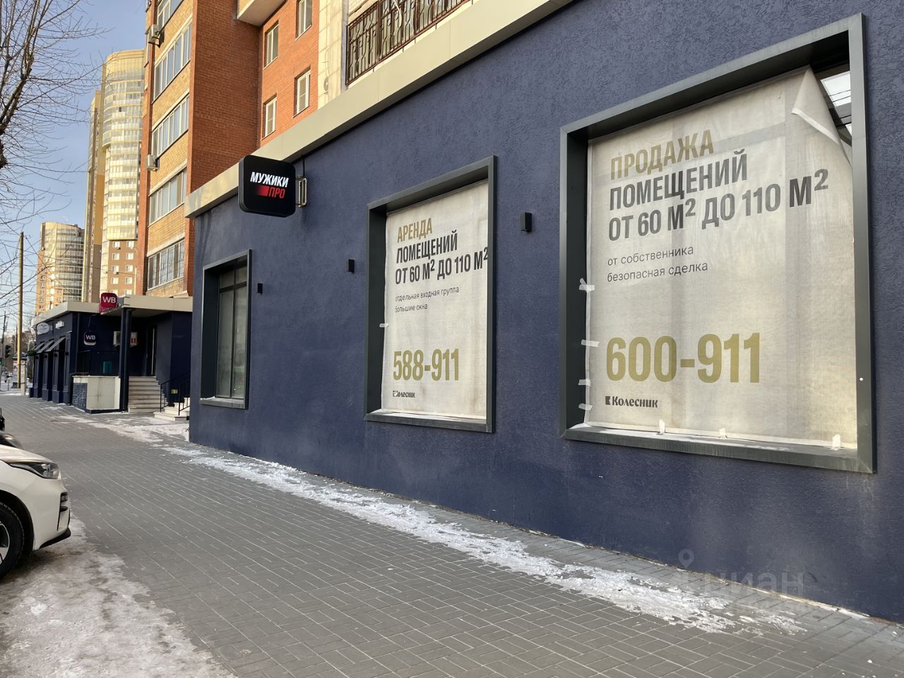 Соседние помещения занимают: барбершоп МужикиПро, химчистка, кофейня, Wildberries, Ozon, магазин одежды, салон цветов и т.д. Через дорогу — школа.