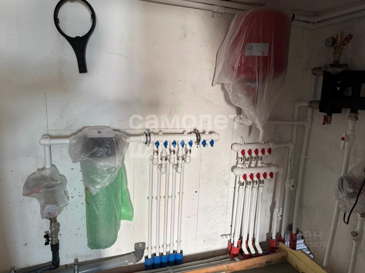 В доме заведен газ, установлен котёл, электричество, центральный водопровод (так же имеется скважина), септик 25 куб.м. Оборудована котельная, смонтирована электрика, стяжка пола, выровнены стены.
