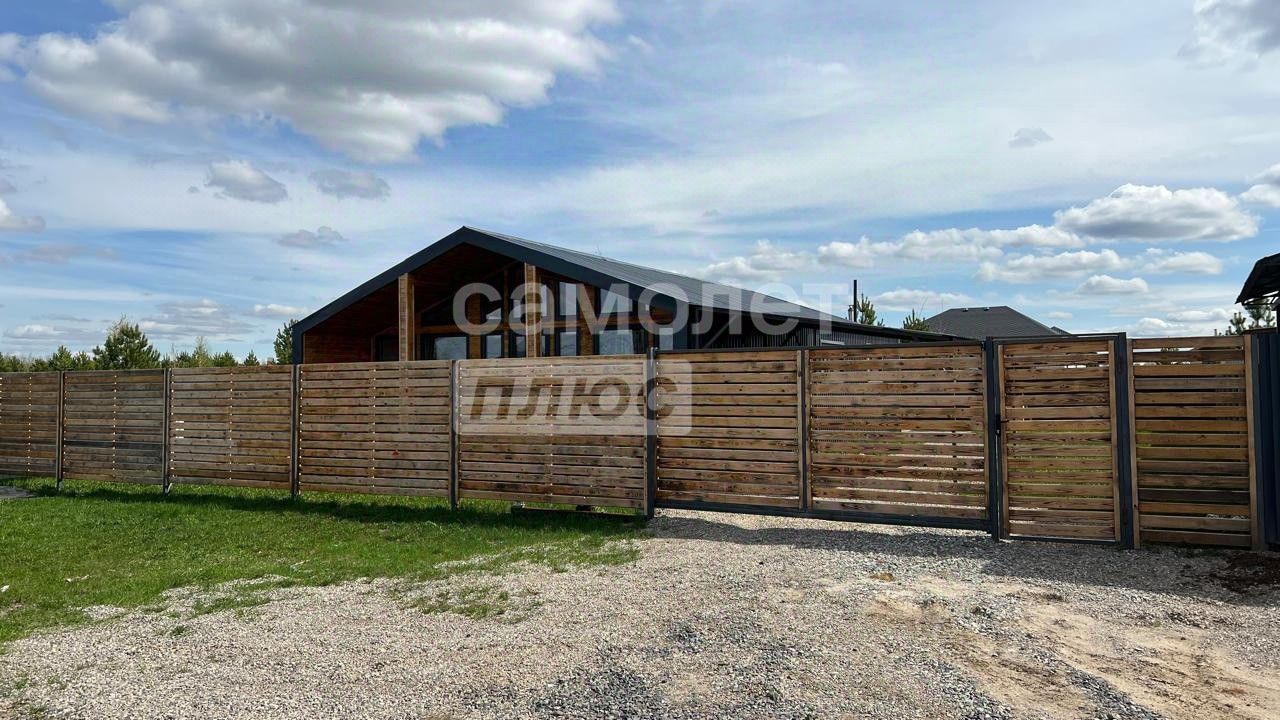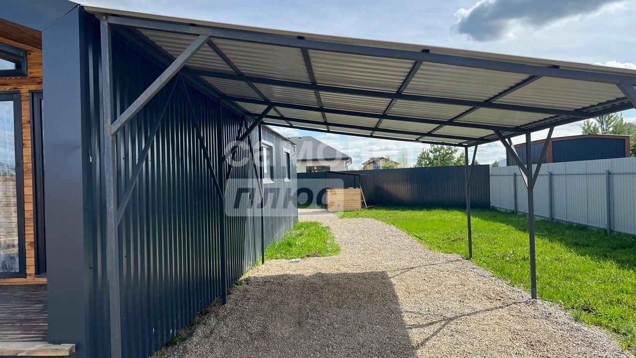 - участок огорожен забором высотой 2 метра из профилированного листа С-8 толщиной 0,45 мм цвет графит RАL 7024 - лицевая часть забора выполнена из жженой доски покрытой пропиткой Реnоtех Fосus Аqwа в стиле ''Ранчо'' - Установлены откатные ворота размером 4000х2000 мм, на фурнитуре фирмы АЛЮТЕХ, с электроприводом с функцией подключения к системе умный дом. - с права от дома установлен 6 метровый навес шириной 4 метра и высотой 3 метра, выполненный в едином стиле с домом. Участок высокий и ровный отсыпка не требуется. - для скважины выполнен отдельный короб из жженой доски покрытый пропиткой и утеплённый внутри пеноплексом и греющим кабелем.