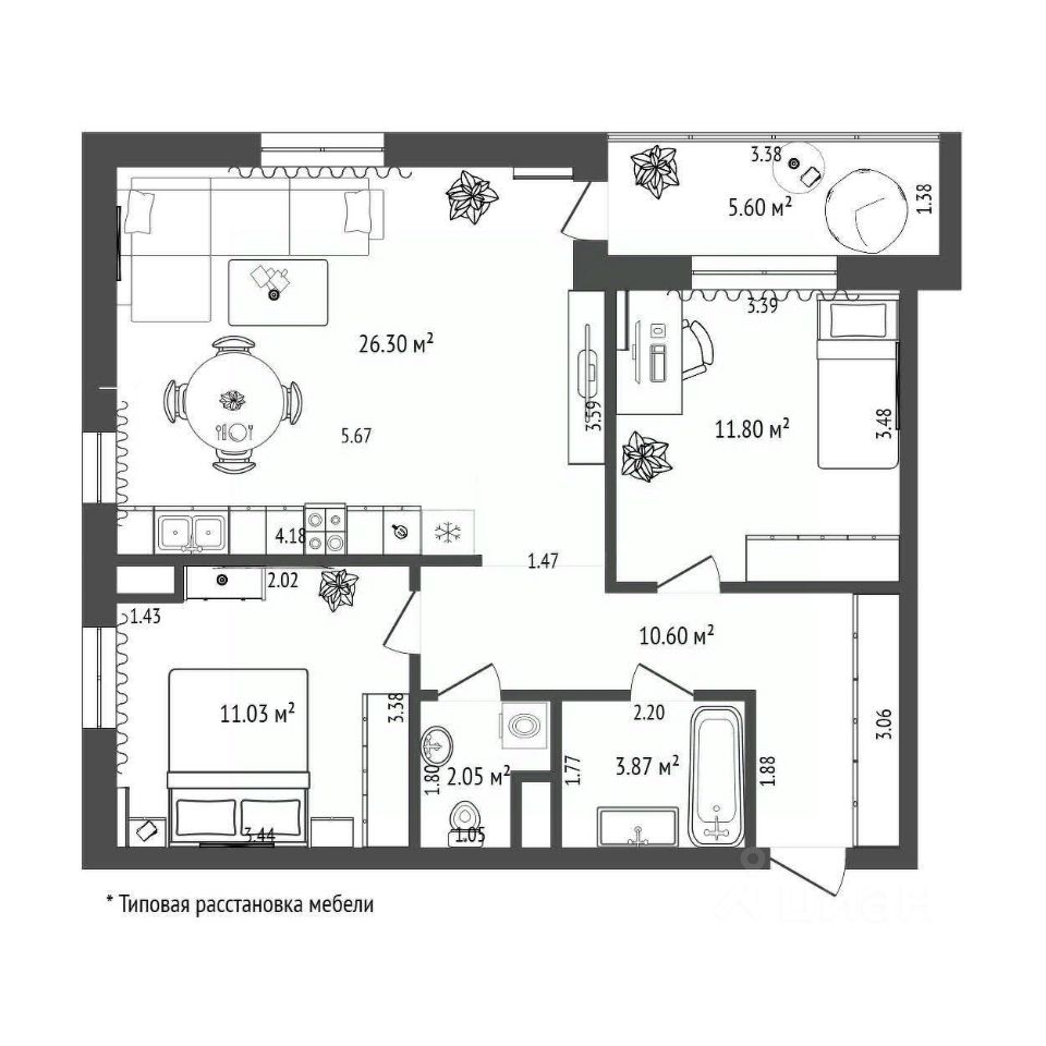 Квартира формата 2+ с видом на реку Тура в ЖК ''Европейский берег''