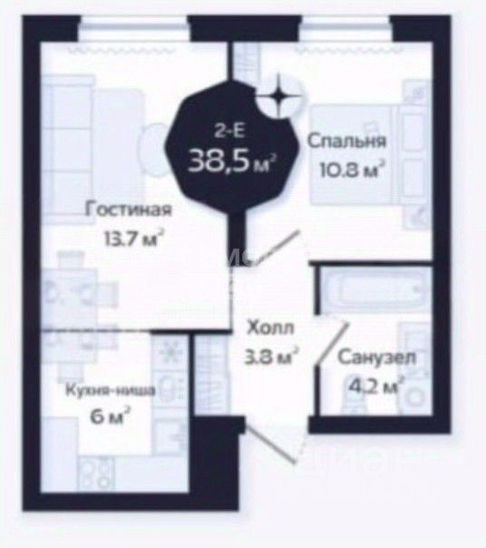 Площадь квартиры 38,3 кв.м. Спальня 10,8 кв.м., комната — 19,3 кв.м. в т.ч с нишей под кухню 6 кв.м.