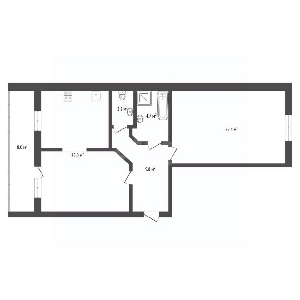 Квартира отличается продуманной планировкой с раздельным санузлом и кухней-гостиной площадью 25 кв.м. Две изолированные комнаты 14 и 13 кв.м. обеспечивают приватность. Все помещения светлые, окна выходят на две стороны.
