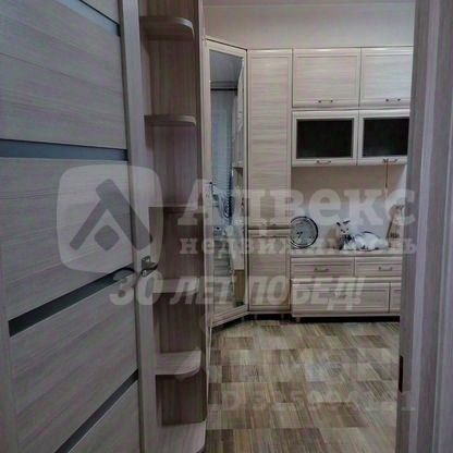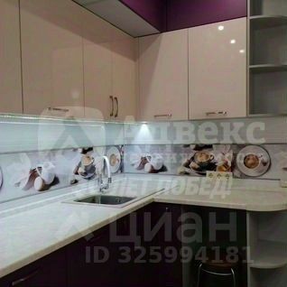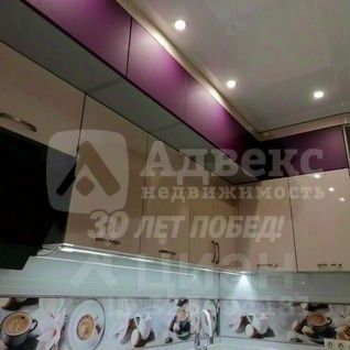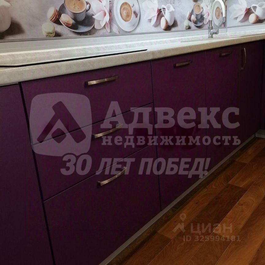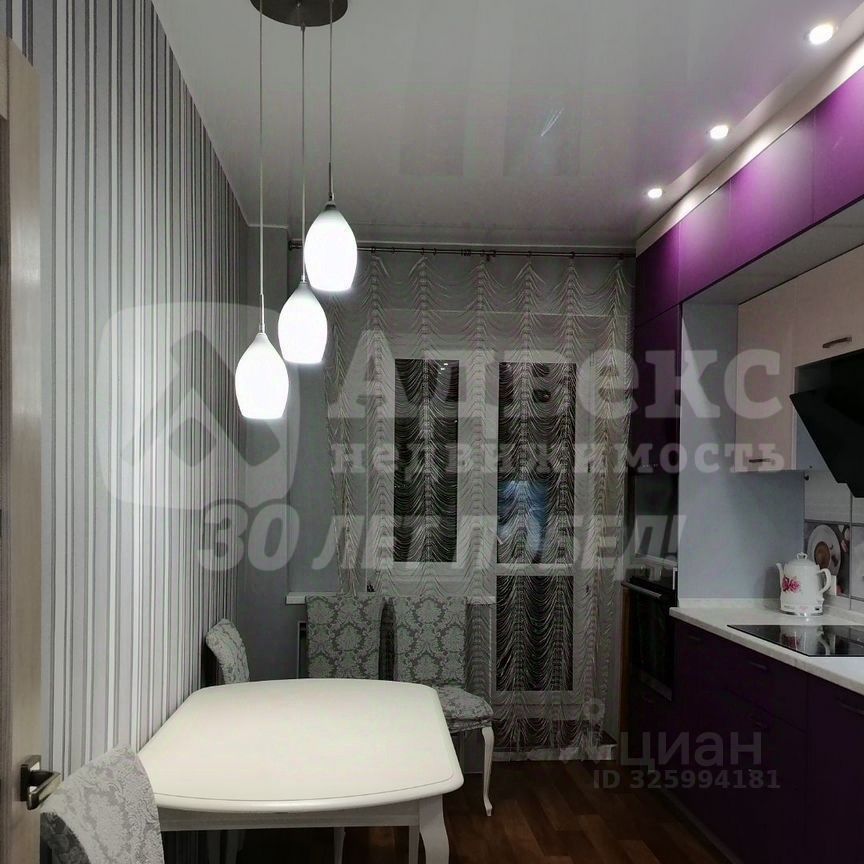 Кухня оборудована современной техникой, включая встроенную духовку и вытяжку. Интерьер выполнен в светлых тонах с акцентами фиолетового цвета, создающими стильный и современный вид. В прихожей установлен вместительный шкаф-купе, а в гостиной также современная вместительная стенка и удобный диван.