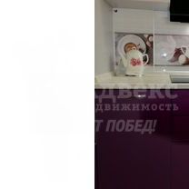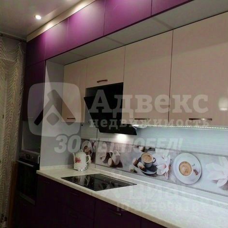 Кухня оборудована современной техникой, включая встроенную духовку и вытяжку. Интерьер выполнен в светлых тонах с акцентами фиолетового цвета, создающими стильный и современный вид. В прихожей установлен вместительный шкаф-купе, а в гостиной также современная вместительная стенка и удобный диван.