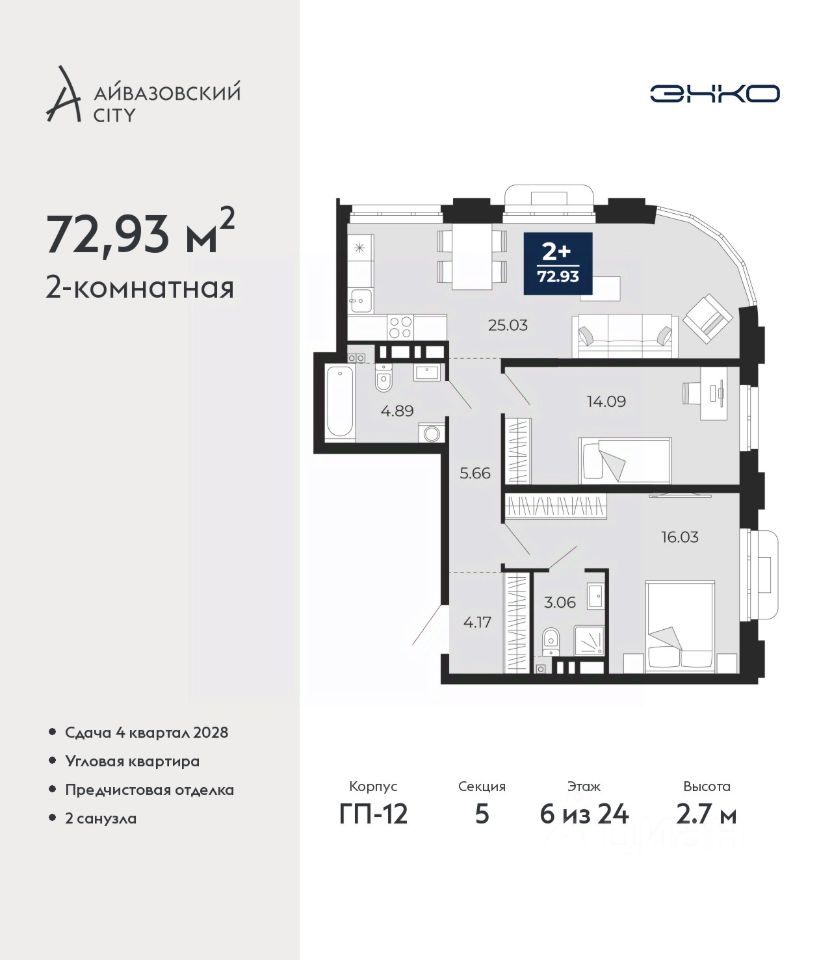 2-комн. квартира с предчистовой отделкой в ЖК ''Айвазовский City'' на 6 этаже. Общая площадь: 72.93 кв.м., жилая: 30.12 кв.м., площадь просторной кухни-столовой: 25.03 кв.м. Угловая квартира, очень светлая, естественная вентиляция при открытии окон. В квартире два совмещенных санузла. Высота потолков 2.7 м.