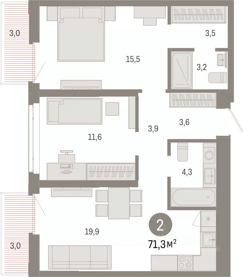 Просторная двухкомнатная квартира с предчистовой отделкой в ЖК ''Республики 205'' на 4 этаже. Общая площадь: 71.34 кв.м. Высота потолков 2.7 м.