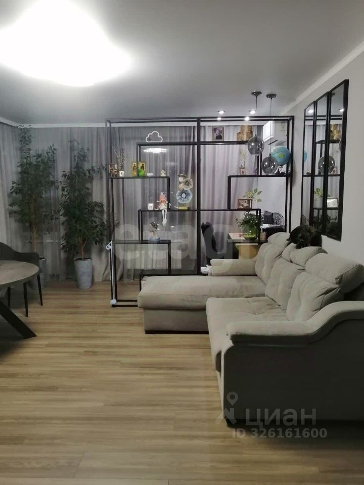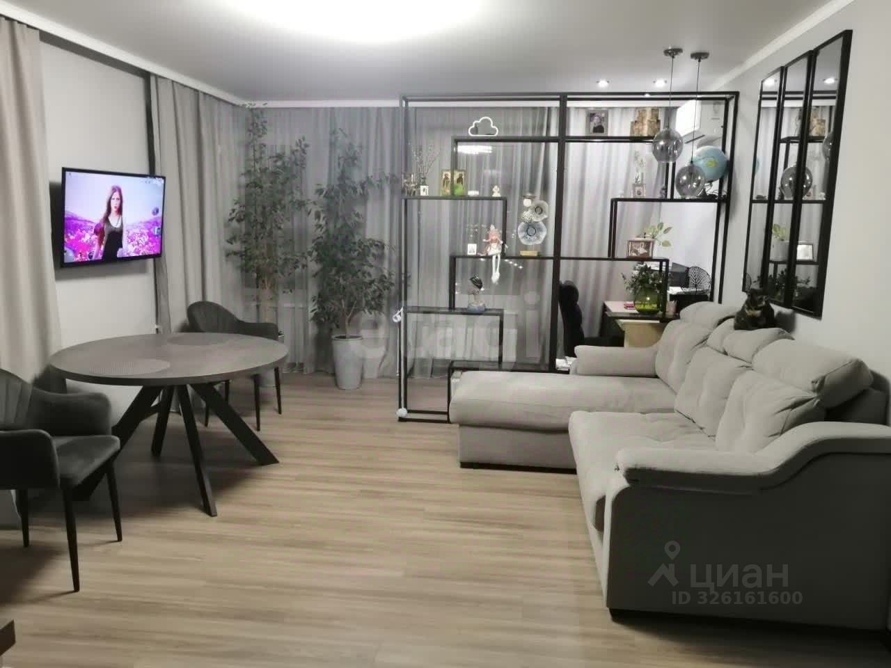 Функциональная планировка с отлично продуманным зонированием, включает в себя: кухню-столовую, перетекающую в гостиную - общая площадь этого пространства 27 кв.м., интересное решение разделения на зоны посредством стеллажа, 2 спальни, раздельный с/у, гардеробная.