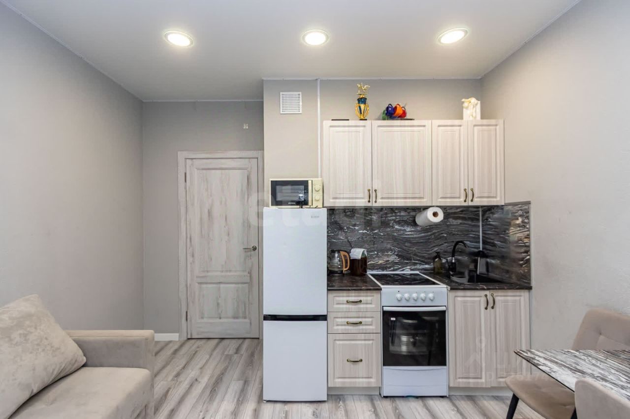 Квартира-студия площадью 18,9 кв. м с застекленной лоджией в жилом комплексе ''Преображенский на Московском'' в Тюмени. Объект полностью готов к проживанию: выполнен качественный ремонт с использованием современных материалов. Вся мебель и бытовая техника остаются в собственности нового владельца, что позволяет заселиться сразу после покупки. Жилой комплекс состоит из семи многоэтажных домов с закрытой охраняемой территорией, оборудованной детскими площадками, зонами воркаута и местами для парковки велосипедов и колясок.