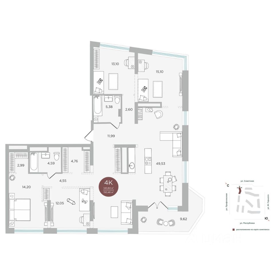 Территория квартала - это квадрат улиц Профсоюзная-Республики-Советская-М.Горького. Застройщиком спроектированы квартиры от студий до четырехкомнатных, общей площадью от 29.6 до 146.3 кв. м. Дома сдаются в предчистовой отделке.