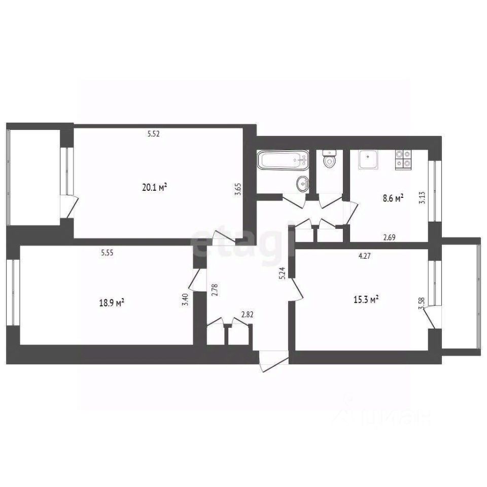 В квартиру три изолированные комнаты (20,1 кв.м, 18,9 кв.м. и 15,3 кв.м.), а так же просторная входная зона.