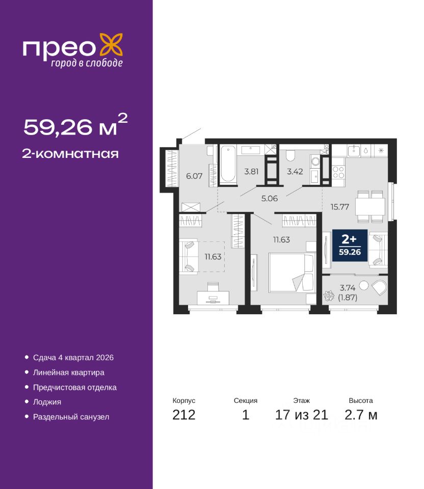 2-комн. квартира с предчистовой отделкой в ЖК ''Прео'' на 17 этаже. Общая площадь: 59.26 кв.м., жилая: 23.26 кв.м., площадь просторной кухни-столовой: 15.77 кв.м. Комнаты изолированные, все окна выходят на одну сторону. В квартире одна лоджия, один раздельный санузел. Высота потолков 2.7 м.