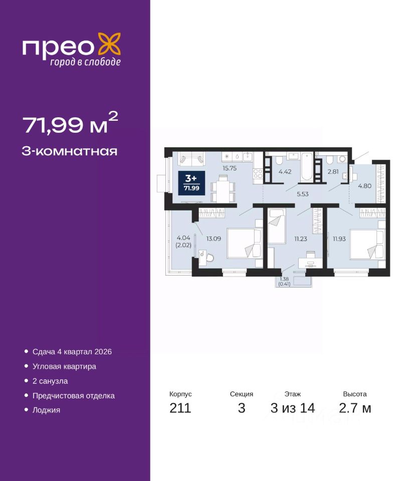 Продается 3-комн. квартира с предчистовой отделкой в ЖК ''Прео'' на 3 этаже. Общая площадь: 71.99 кв.м., жилая: 36.25 кв.м., площадь просторной кухни-столовой: 15.75 кв.м. Квартира угловая, идеально подойдет любителям тишины и панорамных видов. В квартире одна лоджия, один совмещенный и один раздельный санузел. Высота потолков 2.7 м.
