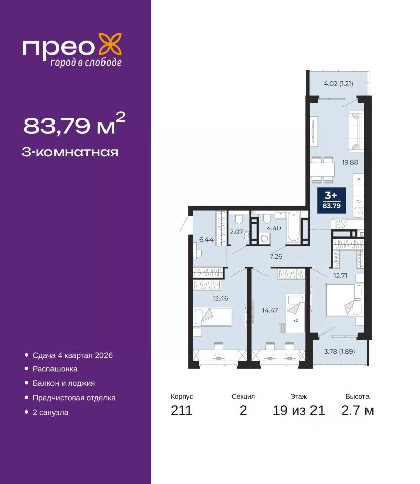3-комн. квартира от застройщика с предчистовой отделкой в ЖК ''Прео'' на 19 этаже. Общая площадь: 83.79 кв.м., жилая: 40.64 кв.м., площадь просторной кухни-столовой: 19.88 кв.м. Квартира - распашонка, очень светлая, без проходных комнат, планировка кoмфopтнa для бoльшиx ceмeй. В квартире один балкон и одна лоджия, один совмещенный и один раздельный санузел. Высота потолков 2.7 м.