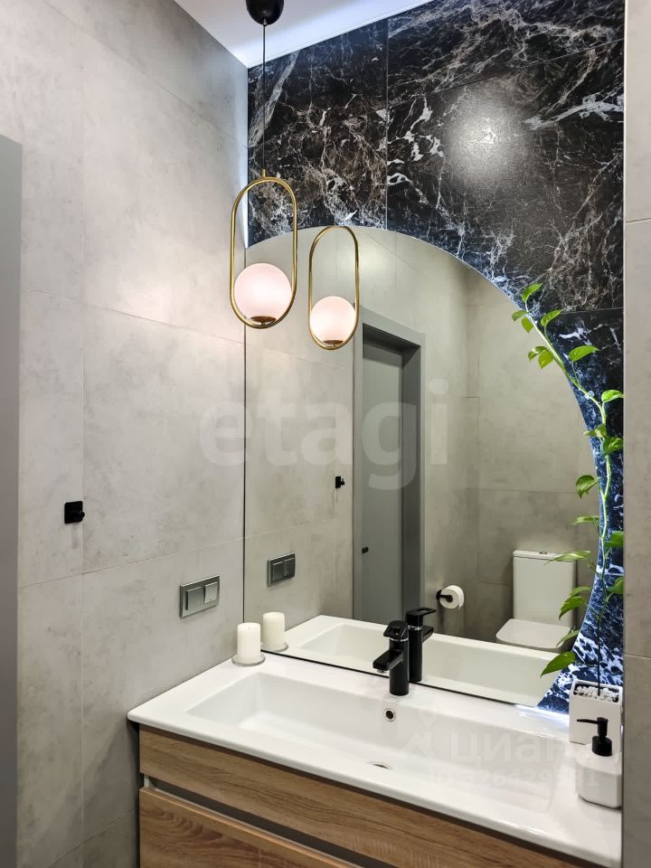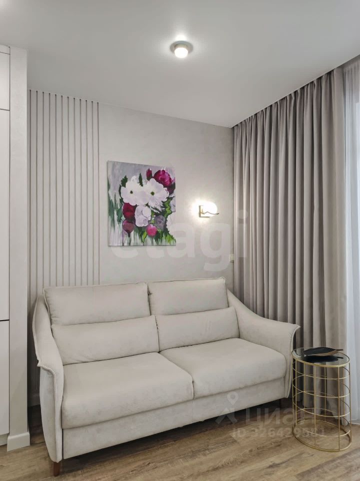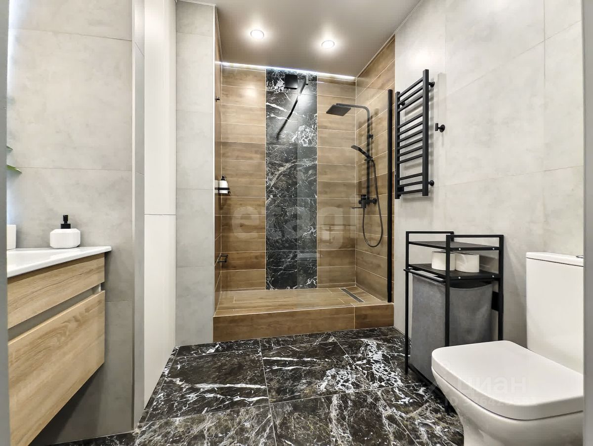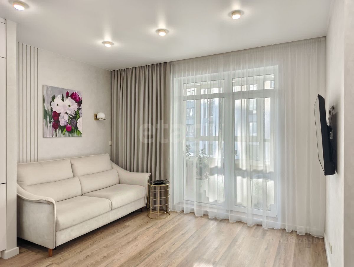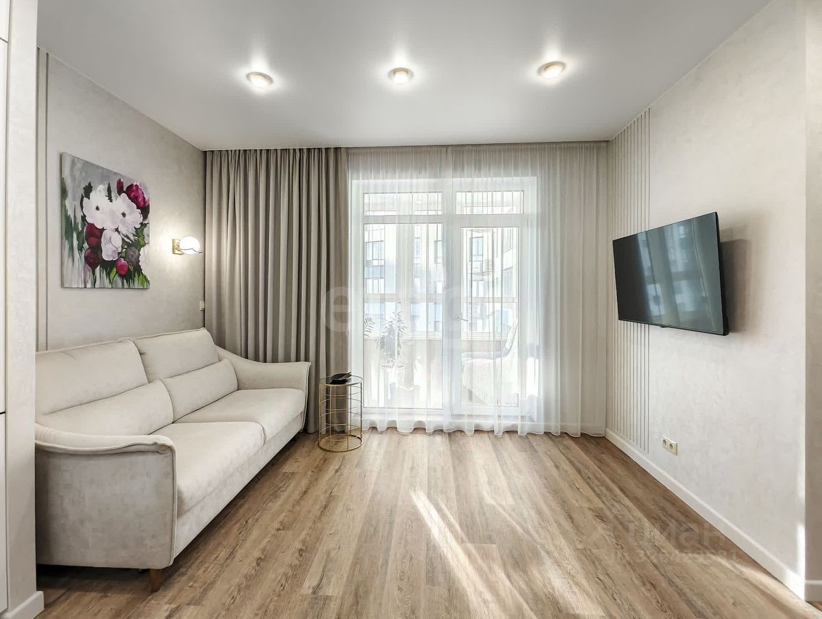 В квартире выполнен ремонт по дизайн-проекту с использованием качественных и дорогостоящих материалов. Декоративная штукатурка на стенах, кварцвинил на полу. Белые матовые натяжные потолки. Керамогранит в ванной.