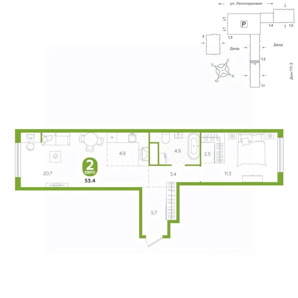 Квартира располагается в ГК ''Чистые Пруды'' от ''Паритет девелопмент''. Это флагманский проект компании в Тюмени. Расположение вдали от шумных улиц и оживленного центра создает ощущение жизни на природе и окружает тишиной и спокойствием. Есть вся необходимая социальная и коммерческая инфраструктура: магазины и сфера услуг на первых этажах. Школы, сады, поликлиника, парки в шаговой доступности. Квартал строится в районе Новой Лесобазы. Рядом выезд на объездную, что существенно экономит время. Поездка до центра города на автомобиле занимает 15-20 минут. Городские кварталы ''Чистые Пруды'' сформирован из домов переменной этажности и многоуровневых паркингов. Ввод 1 очереди строительства запланирован на II кв. 2028 года. Всё благоустройство квартала представлено двумя функциональными зонами: приватная внутри дворовая и общественная. Каждый закрытый двор имеет выход на единую променадную зону - бульвар. Концепция благоустройства основана на принципе модульности, что формирует основную идею приватности. Приватность проекта подчеркивает его особенный климат внутри. Модульное благоустройство позволит максимально эффективно использовать пространство двора и удовлетворить потребности различных категорий жителей. В квартирах базово выполнена улучшенная черновая отделка, которая включает в себя: выровненные стены, стяжка пола с шумоизоляцией, горизонтальная разводка отопления, установлены счетчики с телеметрией, окна с 5-камерным профилем и надежные входные двери. При желании можно добавить ремонт от застройщика и включить его в стоимость ипотеки, что позволит сэкономить на стройматериалах и переехать сразу после получения ключей. Характеристики квартиры: этаж - 4 количество комнат - 2 номер помещения - 36 площадь квартиры - 53,4 кв.мГармоничные пропорции и большие окна наполняют пространство светом, создавая уютную атмосферу. Умное зонирование позволяет удобно организовать как рабочую, так и жилую зоны, что особенно важно для современных жителей. Санузел спроектирован с учетом всех потребностей: здесь есть ванна и место для стиральной машины. Каждый метр квартиры используется с максимальной эффективностью, что делает эту планировку отличным выбором для тех, кто ценит комфорт и удобство.
