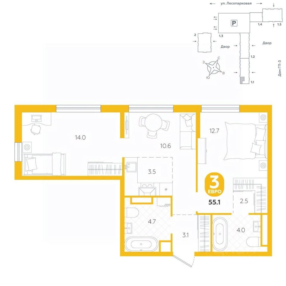 Квартира располагается в ГК ''Чистые Пруды'' от ''Паритет девелопмент''. Это флагманский проект компании в Тюмени. Расположение вдали от шумных улиц и оживленного центра создает ощущение жизни на природе и окружает тишиной и спокойствием. Есть вся необходимая социальная и коммерческая инфраструктура: магазины и сфера услуг на первых этажах. Школы, сады, поликлиника, парки в шаговой доступности. Квартал строится в районе Новой Лесобазы. Рядом выезд на объездную, что существенно экономит время. Поездка до центра города на автомобиле занимает 15-20 минут. Городские кварталы ''Чистые Пруды'' сформирован из домов переменной этажности и многоуровневых паркингов. Ввод 1 очереди строительства запланирован на II кв. 2028 года. Всё благоустройство квартала представлено двумя функциональными зонами: приватная внутри дворовая и общественная. Каждый закрытый двор имеет выход на единую променадную зону - бульвар. Концепция благоустройства основана на принципе модульности, что формирует основную идею приватности. Приватность проекта подчеркивает его особенный климат внутри. Модульное благоустройство позволит максимально эффективно использовать пространство двора и удовлетворить потребности различных категорий жителей. В квартирах базово выполнена улучшенная черновая отделка, которая включает в себя: выровненные стены, стяжка пола с шумоизоляцией, горизонтальная разводка отопления, установлены счетчики с телеметрией, окна с 5-камерным профилем и надежные входные двери. При желании можно добавить ремонт от застройщика и включить его в стоимость ипотеки, что позволит сэкономить на стройматериалах и переехать сразу после получения ключей. Характеристики квартиры: этаж - 3 количество комнат - 3 номер помещения - 21 площадь квартиры - 55,1 кв.мГармоничные пропорции и большие окна наполняют пространство светом, создавая уютную атмосферу. Умное зонирование позволяет удобно организовать как рабочую, так и жилую зоны, что особенно важно для современных жителей. Санузел спроектирован с учетом всех потребностей: здесь есть ванна и место для стиральной машины. Каждый метр квартиры используется с максимальной эффективностью, что делает эту планировку отличным выбором для тех, кто ценит комфорт и удобство.