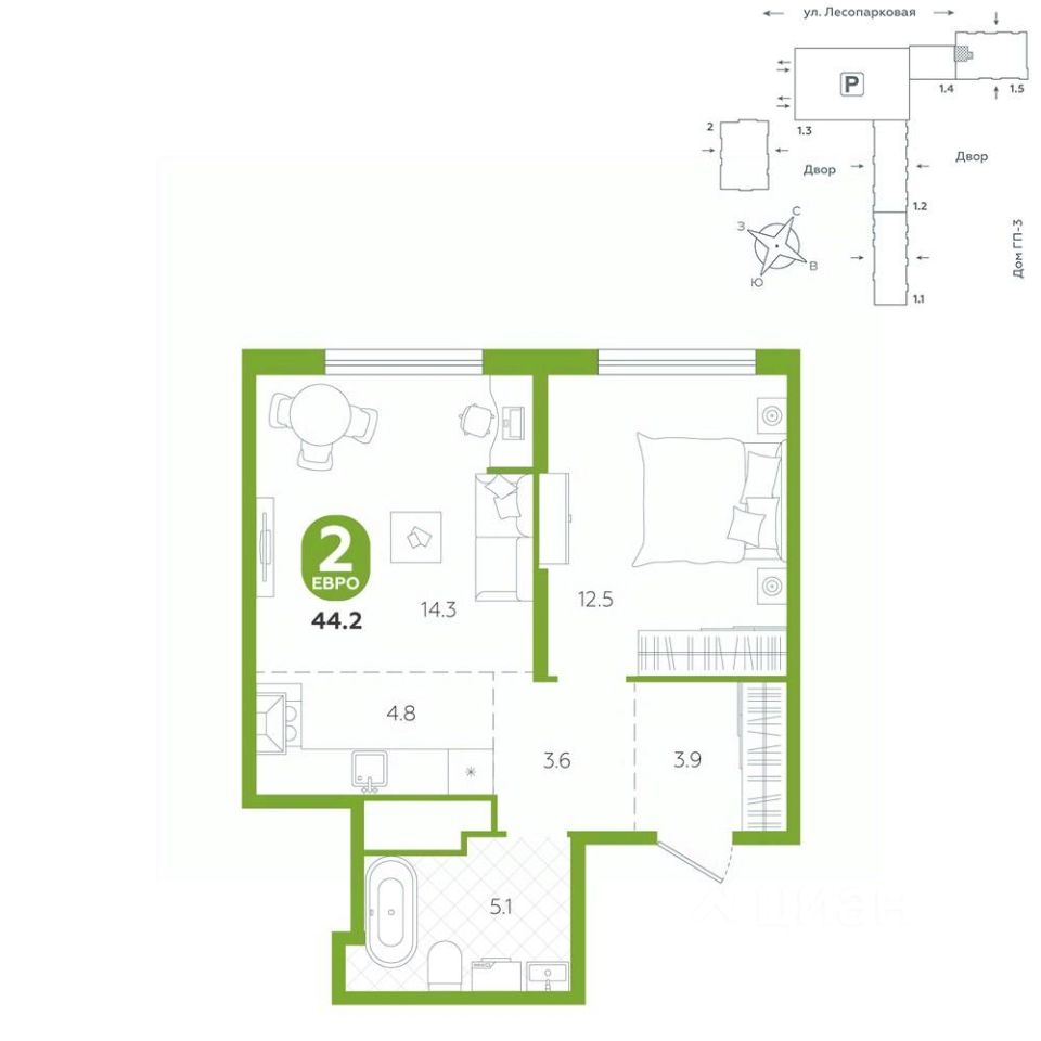 Квартира располагается в ГК ''Чистые Пруды'' от ''Паритет девелопмент''. Это флагманский проект компании в Тюмени. Расположение вдали от шумных улиц и оживленного центра создает ощущение жизни на природе и окружает тишиной и спокойствием. Есть вся необходимая социальная и коммерческая инфраструктура: магазины и сфера услуг на первых этажах. Школы, сады, поликлиника, парки в шаговой доступности. Квартал строится в районе Новой Лесобазы. Рядом выезд на объездную, что существенно экономит время. Поездка до центра города на автомобиле занимает 15-20 минут. Городские кварталы ''Чистые Пруды'' сформирован из домов переменной этажности и многоуровневых паркингов. Ввод 1 очереди строительства запланирован на II кв. 2028 года. Всё благоустройство квартала представлено двумя функциональными зонами: приватная внутри дворовая и общественная. Каждый закрытый двор имеет выход на единую променадную зону - бульвар. Концепция благоустройства основана на принципе модульности, что формирует основную идею приватности. Приватность проекта подчеркивает его особенный климат внутри. Модульное благоустройство позволит максимально эффективно использовать пространство двора и удовлетворить потребности различных категорий жителей. В квартирах базово выполнена улучшенная черновая отделка, которая включает в себя: выровненные стены, стяжка пола с шумоизоляцией, горизонтальная разводка отопления, установлены счетчики с телеметрией, окна с 5-камерным профилем и надежные входные двери. При желании можно добавить ремонт от застройщика и включить его в стоимость ипотеки, что позволит сэкономить на стройматериалах и переехать сразу после получения ключей. Характеристики квартиры: этаж - 3 количество комнат - 2 номер помещения - 288 площадь квартиры - 44,2 кв.мГармоничные пропорции и большие окна наполняют пространство светом, создавая уютную атмосферу. Умное зонирование позволяет удобно организовать как рабочую, так и жилую зоны, что особенно важно для современных жителей. Санузел спроектирован с учетом всех потребностей: здесь есть ванна и место для стиральной машины. Каждый метр квартиры используется с максимальной эффективностью, что делает эту планировку отличным выбором для тех, кто ценит комфорт и удобство.