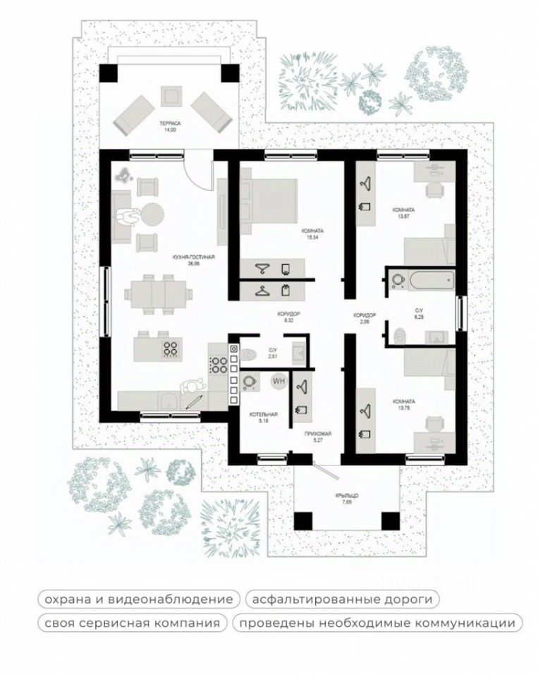• Все коммуникации аккуратно проложены под землёй: газ, электричество, интернет и центральный водопровод.