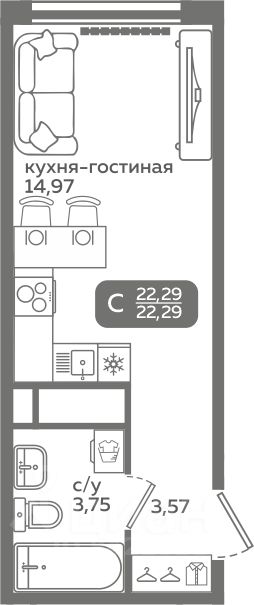 Прямая продажа от застройщика! Продается студия в строящемся ЖК ''Меридиан Слобода'', срок сдачи: I-кв. 2027, общей площадью 22.29 м², на 7 этаже из 21. Площадь кухни — 14.97 м².