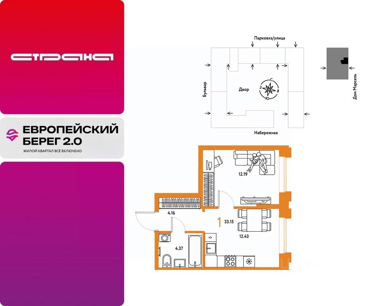 Продается 1комнатная квартира на 20 этаже от застройщика Страна Девелопмент. Площадь квартиры 33,15 кв. м. Стоимость указана без учета акций.
