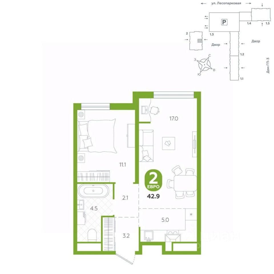 Квартира располагается в ГК ''Чистые Пруды'' от ''Паритет девелопмент''. Это флагманский проект компании в Тюмени. Расположение вдали от шумных улиц и оживленного центра создает ощущение жизни на природе и окружает тишиной и спокойствием. Есть вся необходимая социальная и коммерческая инфраструктура: магазины и сфера услуг на первых этажах. Школы, сады, поликлиника, парки в шаговой доступности. Квартал строится в районе Новой Лесобазы. Рядом выезд на объездную, что существенно экономит время. Поездка до центра города на автомобиле занимает 15-20 минут. Городские кварталы ''Чистые Пруды''сформирован из домов переменной этажности и многоуровневых паркингов. Ввод 1 очереди строительства запланирован на II кв. 2028 года. Всё благоустройство квартала представлено двумя функциональными зонами: приватная внутри дворовая и общественная. Каждый закрытый двор имеет выход на единую променадную зону - бульвар. Концепция благоустройства основана на принципе модульности, что формирует основную идею приватности. Приватность проекта подчеркивает его особенный климат внутри. Модульное благоустройство позволит максимально эффективно использовать пространство двора и удовлетворить потребности различных категорий жителей. В квартирах базово выполнена улучшенная черновая отделка, которая включает в себя: выровненные стены, стяжка пола с шумоизоляцией, горизонтальная разводка отопления, установлены счетчики с телеметрией, окна с 5-камерным профилем и надежные входные двери. При желании можно добавить ремонт от застройщика и включить его в стоимость ипотеки, что позволит сэкономить на стройматериалах и переехать сразу после получения ключей. Характеристики квартиры: этаж - 2 количество комнат - 2 номер помещения - 7 площадь квартиры - 42,9 кв.м Гармоничные пропорции и большие окна наполняют пространство светом, создавая уютную атмосферу. Умное зонирование позволяет удобно организовать как рабочую, так и жилую зоны, что особенно важно для современных жителей. Санузел спроектирован с учетом всех потребностей: здесь есть ванна и место для стиральной машины. Каждый метр квартиры используется с максимальной эффективностью, что делает эту планировку отличным выбором для тех, кто ценит комфорт и удобство.